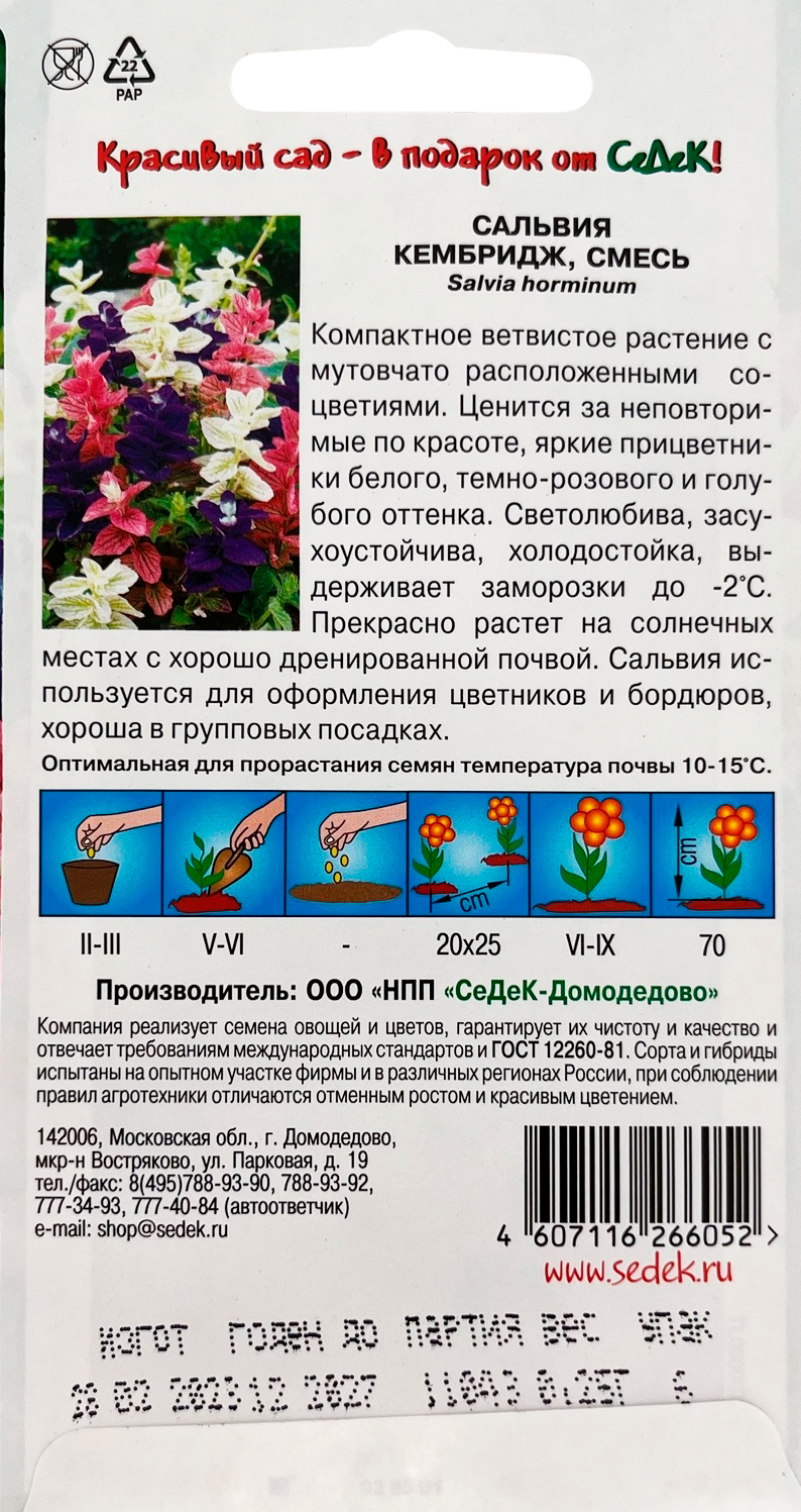 САЛЬВИЯ КЕМБРИДЖ (СМЕСЬ)Компактное ветвистое растение с мутовчато расположенными соцветиями. Ценится за неповторимые по красоте, яркие прицветники белого, темно-розового и голубого оттенков. Светолюбива, засухоустойчива, холодостойка, выдерживает заморозки до -2°С. Прекрасно растет на солнечных местах с хорошо дренированной почвой. Используют для оформления цветников и бордюров, хороша в групповых посадках.