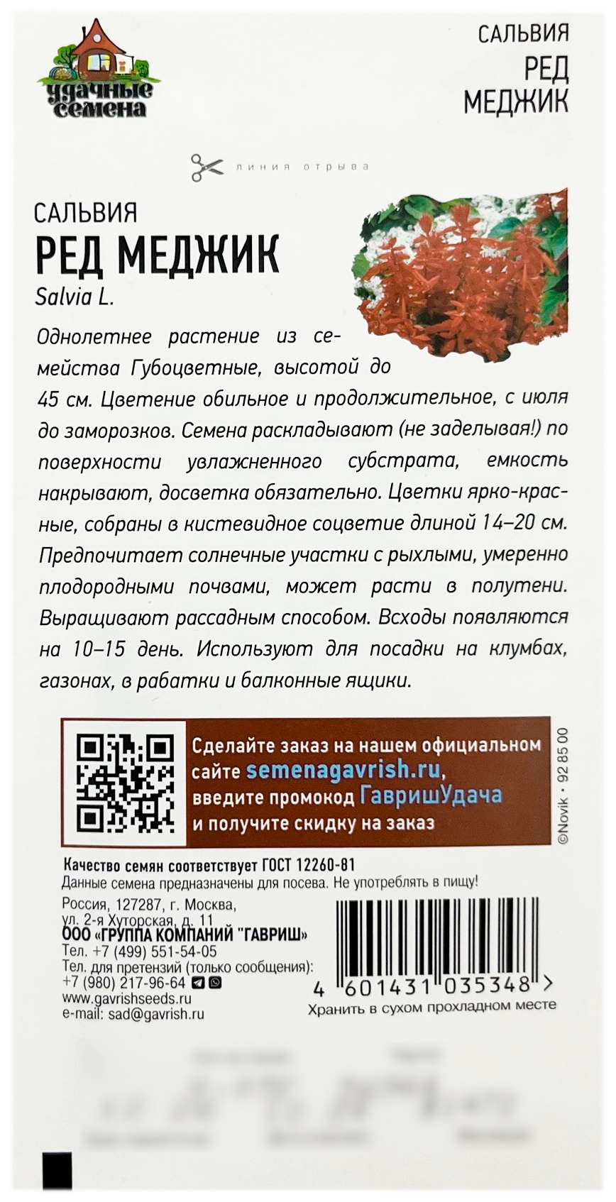 Сальвия РЕД МЕДЖИК ГАВРИШОднолетнее растение из семейства Губоцветные, высотой до 45 см. Цветение обильное и продолжительное с июня до заморозков. Цветки ярко-красные, собраны в кистевидное соцветие длиной 14-20 см. Предпочитает солнечные участки с рыхлыми, умеренно плодородными почвами, может расти в полутени. Выращивают рассадным способом. Всходы появляются на 10-15 день. Используют для посадки на клумбах, газонах, в рабатки и балконные ящики.