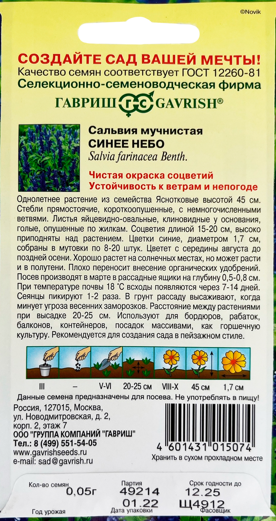 Сальвия Синее небо мучнистая* 0,05 гОднолетнее растение семейства Яснотковые, высотой 60 см. Стебли прямостоячие, короткоопушенные, с немногочисленными ветвями. Листья яйцевидно –овальные, клиновидные у основания, голые, опушенные по жилкам. Соцветия длиной 15-20 см, высоко приподняты над растением. Цветки синие, размером 1,7 см собраны в мутовки по 8-20 штук. Цветет с середины августа до поздней осени. Хорошо растет на солнечных местах, но может расти и в полутени. Плохо переносит внесение органических удобрений. Посев производят в марте в рассадные ящики на глубину 0,5-0,8 см. При температуре почвы +18 °C всходы появляются через 7-14 дней. Сеянцы пикируют 1-2 раза. В грунт рассаду высаживают, когда минует угроза весенних заморозков. Расстояние между растениями при высадке 20-25 см. Используется для бордюров, рабаток, балконов, контейнеров, посадок массивами, как горшечная культура. Рекомендуется для создания сада в пейзажном стиле.
