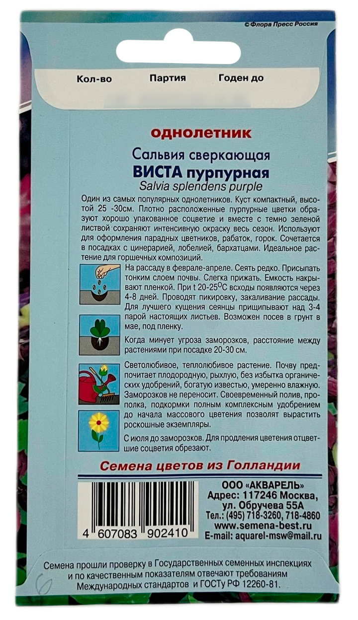 Сальвия сверкающая ВИСТА пурпурная АКВАРЕЛЬКуст компактный, высотой 25-30 см. Растение образует несколько колосовидных соцветий и вместе с темно-зеленой листвой сохраняет декоративность весь сезон. Используют для оформления цветников, рабаток. Сальвия серии Виста хорошо сочетается с цинерарией, лобелией, бархатцами. Идеальное растение для горшечных композиций.
