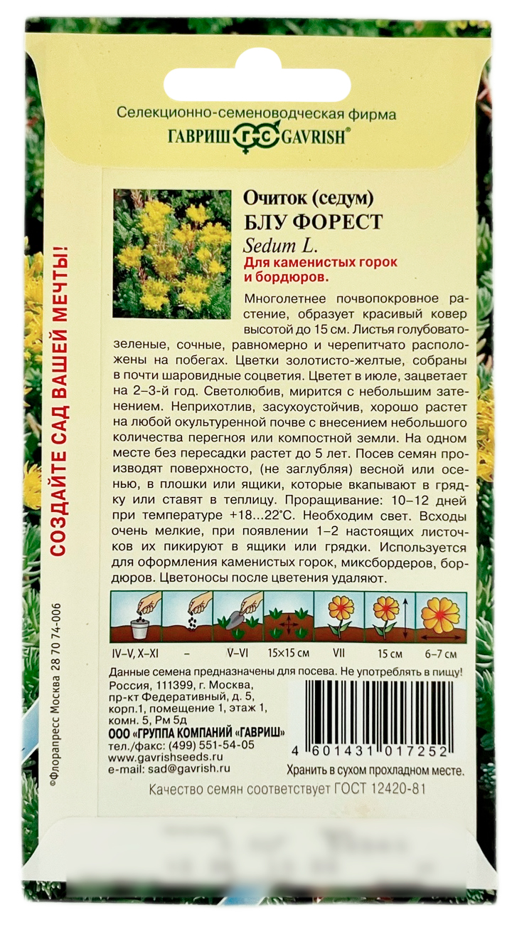 Очиток седум БЛУ ФОРЕСТ ГАВРИШМноголетнее почвопокровное растение, образует красивый ковер высотой до 15 см. Листья голубовато-зеленые, сочные, равномерно и черепитчато расположены на побегах. Цветки золотисто-желтые, собраны в почти шаровидные соцветия. Цветет в июле, зацветает на 2-3-й год. Светолюбив, мирится с небольшим затенением. Неприхотлив, засухоустойчив, хорошо растет на любой окультуренной почве с внесением небольшого количества перегноя или компостной земли. На одном месте без пересадки растет до 5 лет. Посев семян производят весной или осенью, в плошки или ящики, которые вкапывают в грядку или ставят в теплицу. Проращивание:10 -12 дней при температуре 18 -22 °,С. Всходы очень мелкие, при появлении 1-2 настоящих листочков их пикируют в ящики или грядки. Используется для оформления каменистых горок, миксбордеров, бордюров. Цветоносы после цветения удаляют.