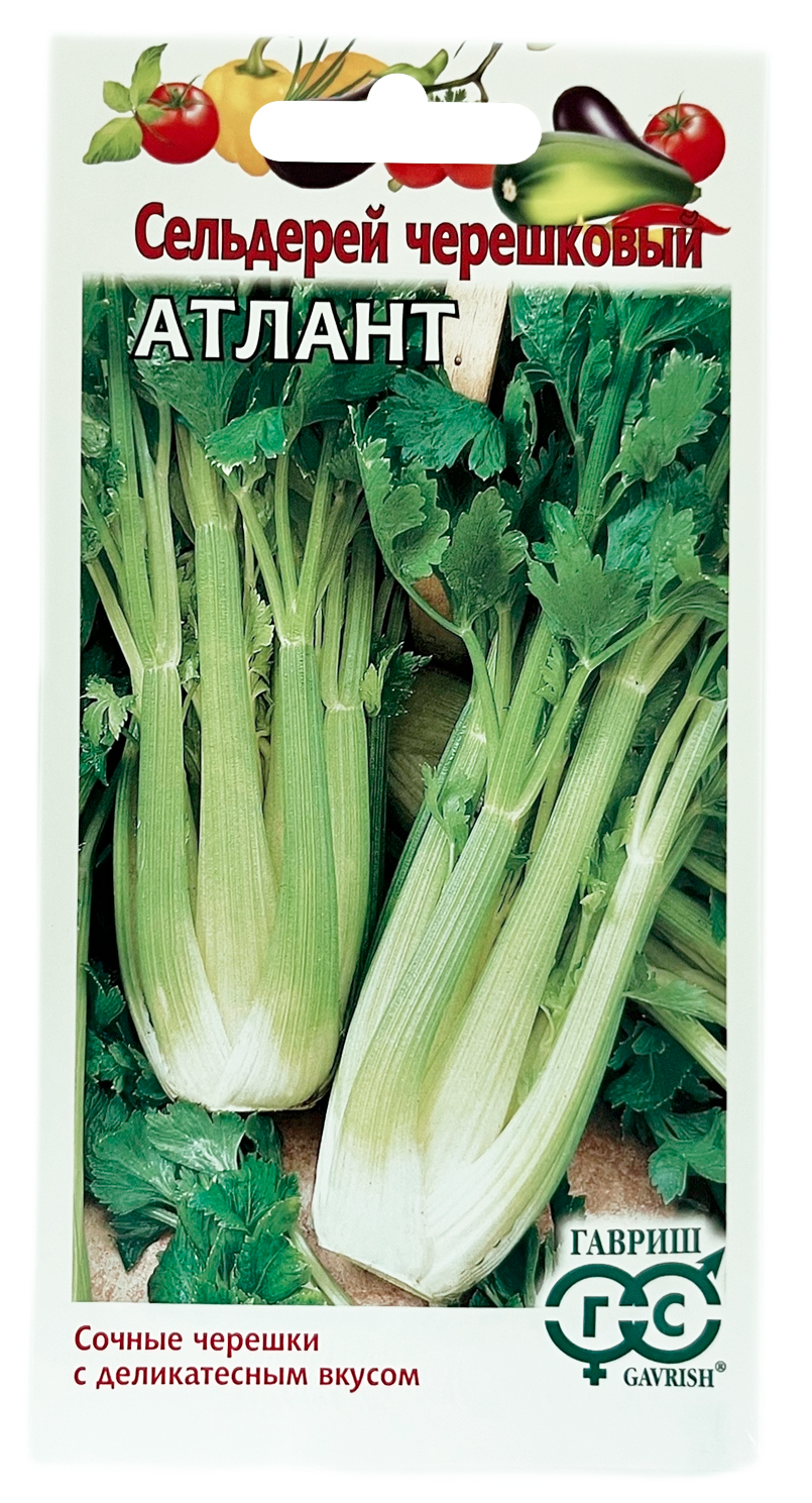 Сельдерей черешковый АТЛАНТ ГАВРИШСреднеспелый (150-170 дней от всходов до технической спелости) сорт черешкового сельдерея. Розетка листьев прямостоячая, диаметром 45-53 см, высотой 40-45 см. Лист средний, зеленый, сильноглянцевый. Черешок среднего размера, зеленый, поверхность слаборебристая. Масса черешков с одного растения 300-400 г. Выращивают рассадным способом. Для улучшения качества черешкового сельдерея его отбеливают. Для этого за две недели до уборки черешки осторожно сдвигают и обертывают плотной бумагой. Рекомендован для потребления в свежем виде, для консервирования и в качестве специи в различные блюда. Урожайность 2,8-3,3 кг/м².