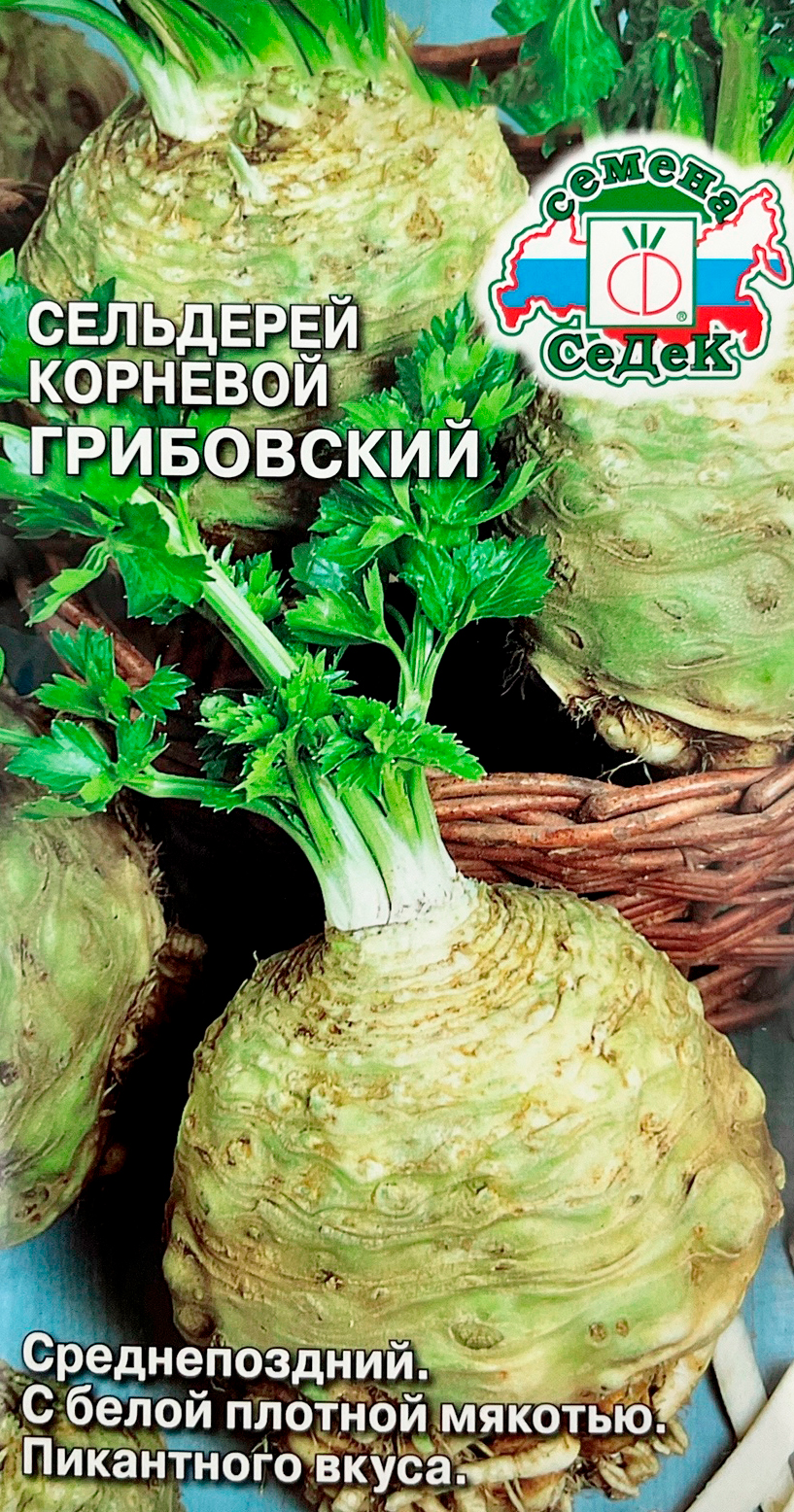 Сельдерей корневой ГРИБОВСКИЙ СеДеКСреднепоздний (180-190 дней) сорт. Розетка листьев полураскидистая, высокорослая. Корнеплоды серовато-белые, округлые, массой 200-250 г, с белой плотной мякотью, пикантного вкуса. Урожайность 2,2-3,0 кг/м 2 . Ценность сорта: холодостойкость, применяется для выгонки зелени в зимнее время. Богат аминокислотами, гликозидами, витаминами С, Е, В, каротиноидами. Употребление сельдерея нормализует состояние пищеварительной, эндокринной и нервной системы, поднимет общий тонус организма, усилит работоспособность. Рекомендуется для употребления в свежем виде и переработки.