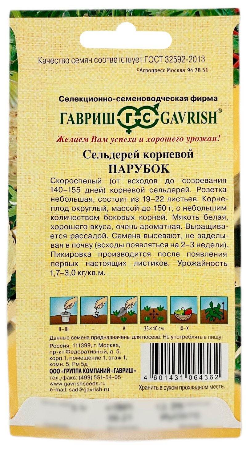 Сельдерей корневой ПАРУБОК ГАВРИШСкороспелый (от всходов до созревания 140-155 дней) корневой сельдерей. Розетка небольшая, состоит из 19-22 листьев. Корнеплод округлый, массой до 150 г, с небольшим количеством боковых корней. Мякоть белая, хорошего вкуса, очень ароматная. Выращивается рассадой. Для быстрого прорастания семена замачивают в воде комнатной температуры на пару суток. После легкого просушивания приступают к посеву в ящики с почвосмесью из дерновой земли, перегноя и песка на глубину 0,5 см. Пикировка производится после появления первых настоящих листиков. Урожайность 1,7-3,0 кг/кв.м.