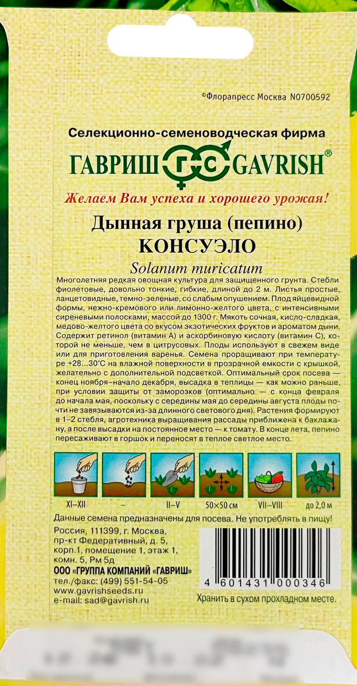 ---Пепино Консуэло 5шт автор. семенаСеменаПосадочный материалГоршки, кашпо, ящики для рассадыУкрашения и дизайн дачного участкаГрунтУдобрения, стимуляторыЯдохимикаты (пестициды)От комаров тараканов муравьев мышей крыс кротовИнструмент, оборудование садовоеТовары для животныхКухня садоводаФлористические материалыЛитератураФитолампыВсе для праздника, нового годаПоливочное оборудованиеХозтоварыУпаковка