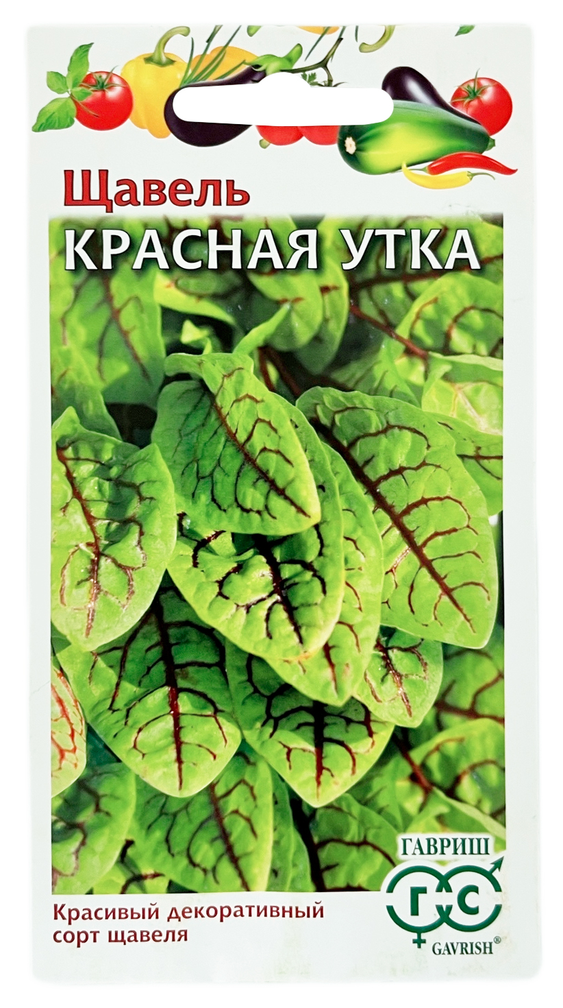 Щавель Красная УткаДекоративный щавель — многолетняя, холодостойкая культура. Сорт раннеспелый, быстрорастущий. Черешки листьев растения окрашены в бордовый цвет. Листья крупные, зеленые с темно-красными прожилками, гладкие длиной до 35 см. Вкус слабокислый. За сезон можно собирать урожай до 5 раз. Для лучшего кущения рекомендуется удалять цветоносы. Молодые листья содержат много витамина С, витамины группы В, каротин и другие ценные органические кислоты, прекрасно подходят для употребления в свежем виде, различных супов и засолки. Щавель можно выращивать на окне, балконе в горшках контейнерах, использовать для декоративного огорода, клумб, миксбордеров, рабаток. Посев производят в открытый грунт в апреле-мае.