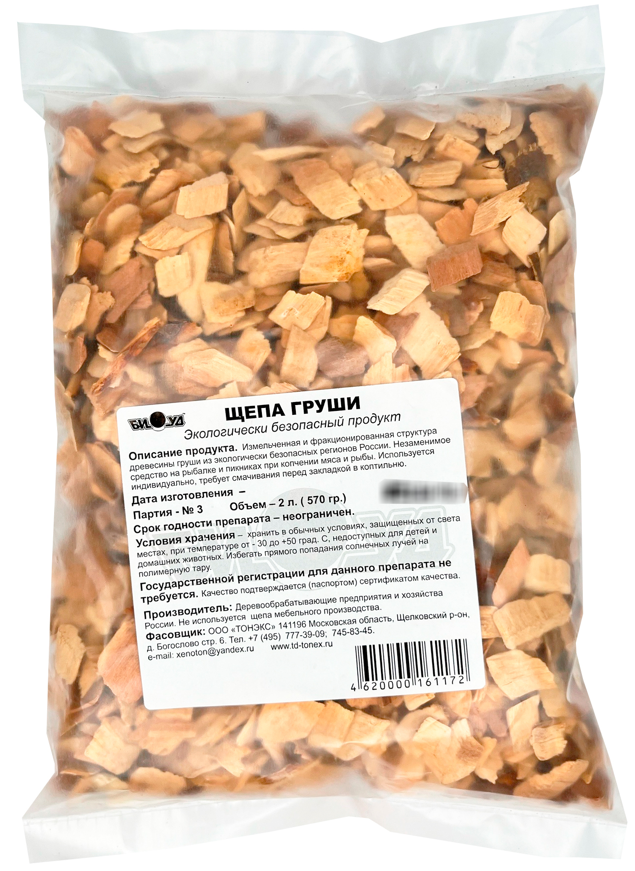 Измельченная и фракционированная структура древесины груши из экологически безопасных регионов России. Незаменимое средство на рыбалке, пикниках при копчении мяса и рыбы. Используется индивидуально, требует смачивания перед закладкой в коптильню.