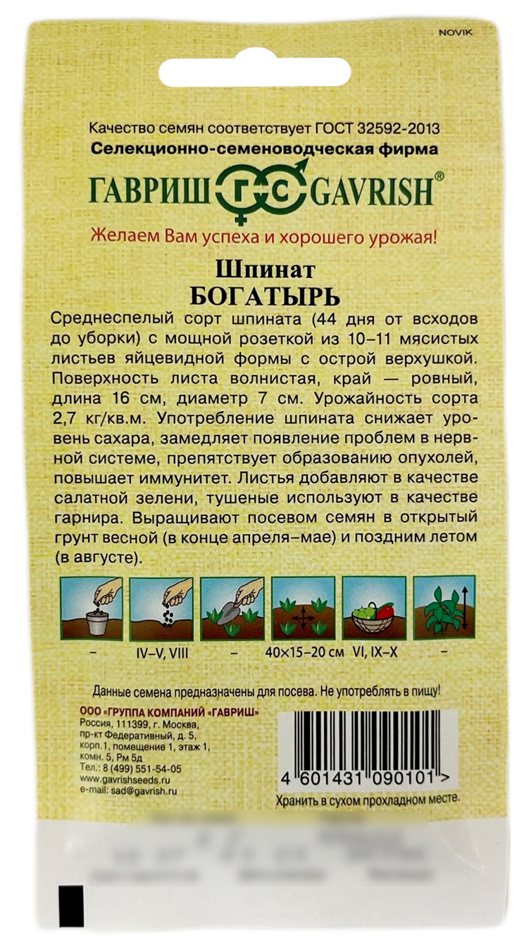 Шпинат БОГАТЫРЬ ГАВРИШСреднеспелый сорт шпината (44 дня от всходов до уборки) с мощной розеткой из 10-11 мясистых листьев яйцевидной формы с острой верхушкой. Поверхность листа волнистая, край — ровный, длина 16 см, диаметр 7 см. Урожайность сорта 2,7 кг/м². Употребление шпината снижает уровень сахара, замедляет появление проблем в нервной системе, препятствует образованию опухолей, повышает иммунитет. Листья добавляют в качестве салатной зелени, тушеные используют в качестве гарнира. Выращивают посевом семян в открытый грунт весной (в конце апреля-мае) и поздним летом (в августе).
