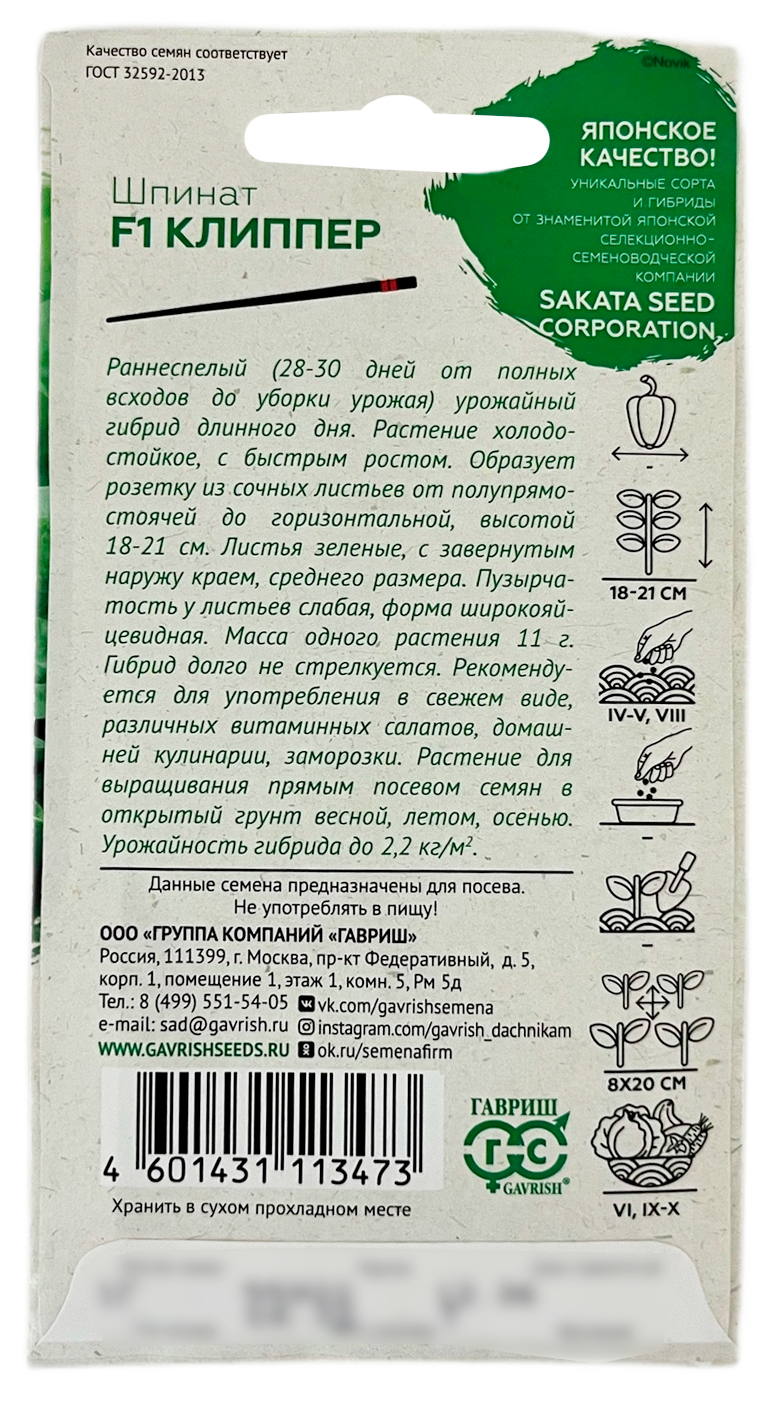 Шпинат КЛИППЕР ГАВРИШРаннеспелый (28–30 дней от полных всходов до уборки урожая) урожайный гибрид длинного дня. Растение холодостойкое с быстрым ростом. Образует розетку из сочных листьев от полупрямостоячей до горизонтальной, высотой 18-21 см. Листья зеленые, с завернутым наружу краем, среднего размера. Пузырчатость у листьев слабая, форма широкояйцевидная. Масса одного растения 11 г. Гибрид долго не стрелкуется. Рекомендуется для употребления в свежем виде, различных витаминных салатов, домашней кулинарии, заморозки. Растение для выращивания посевом семян в открытый грунт весной, летом, осенью. Урожайность сорта до 2,2 кг/м2.