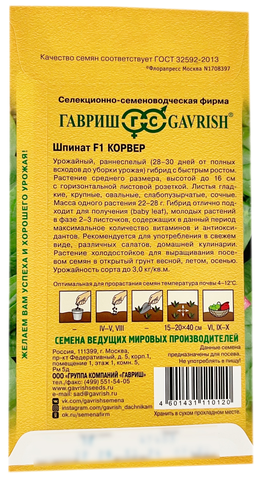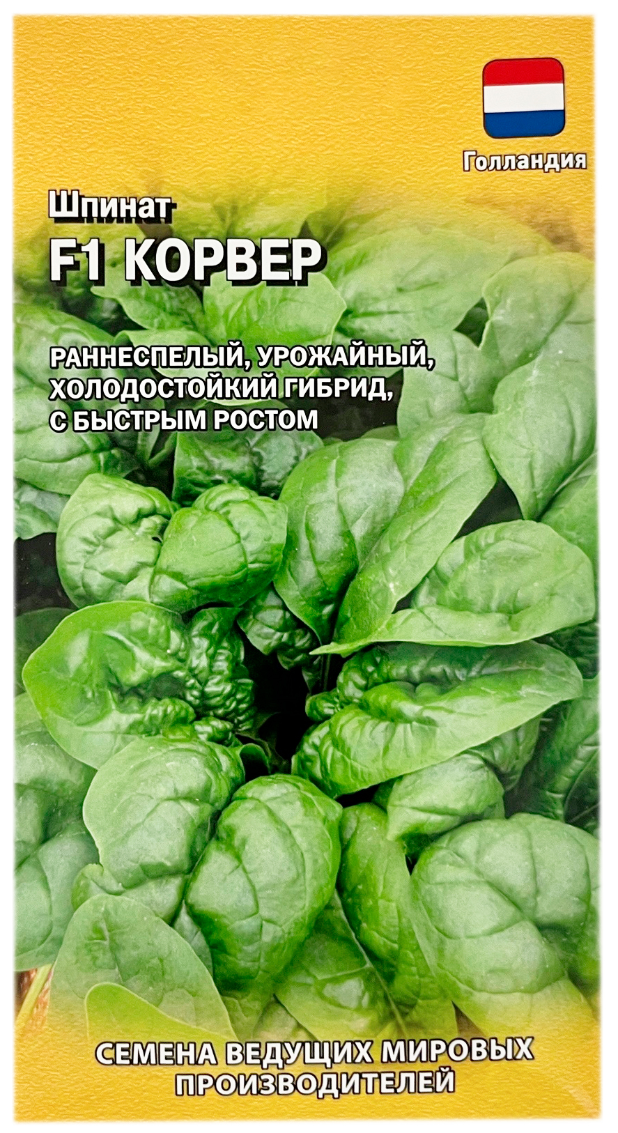 Шпинат F1 КОРВЕР ГАВРИШУрожайный, раннеспелый (28–30 дней от полных всходов до уборки урожая) гибрид с быстрым ростом. Растение среднего размера, высотой до 16 см с горизонтальной листовой розеткой. Листья гладкие, крупные, овальные, слабопузырчатые, сочные. Масса одного растения 22-28 г. Гибрид отлично подходит для получения (baby leaf), молодых растений в фазе 2-3 листочков, содержащих в данный период максимальное количество витаминов и антиоксидантов. Рекомендуется для употребления в свежем виде, различных салатов, домашней кулинарии. Растение холодостойкое для выращивания посевом семян в открытый грунт весной, летом, осенью.
