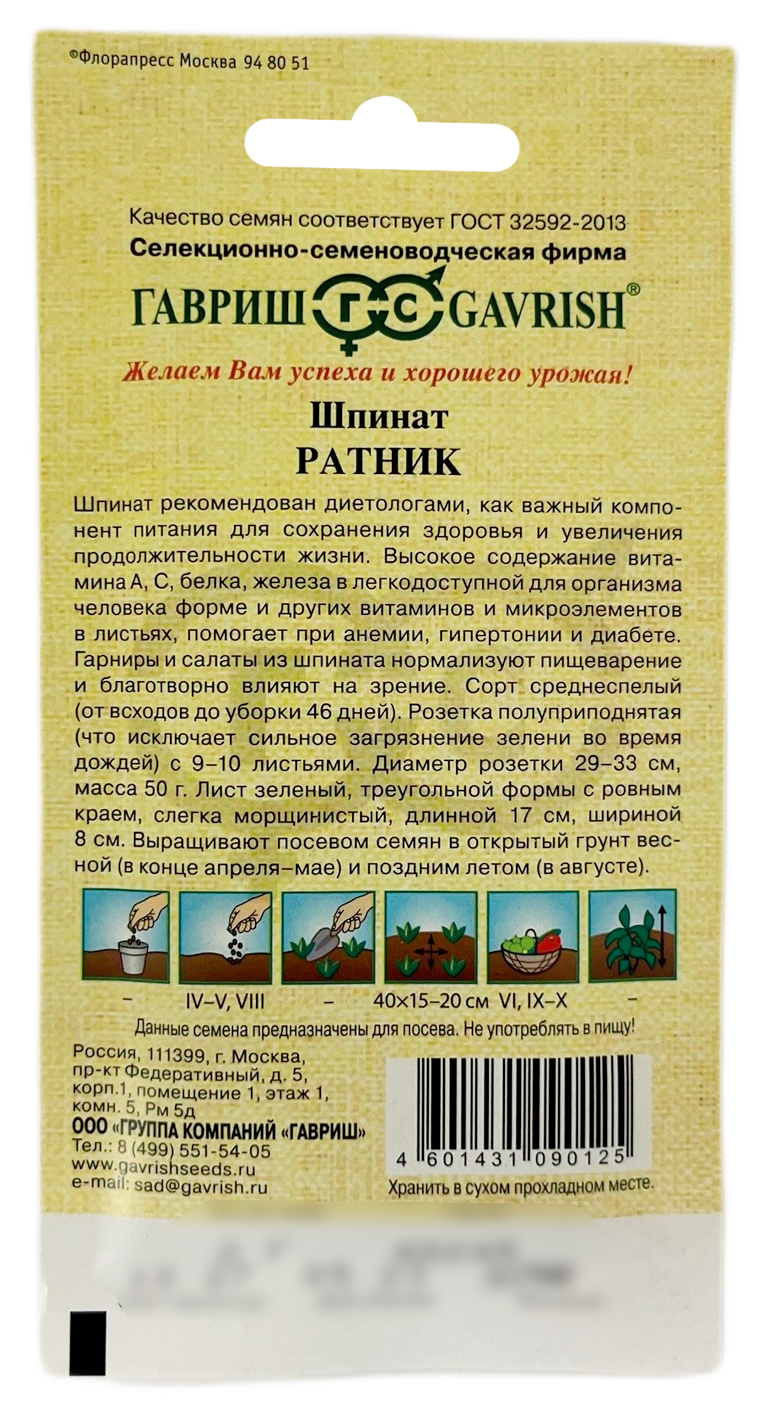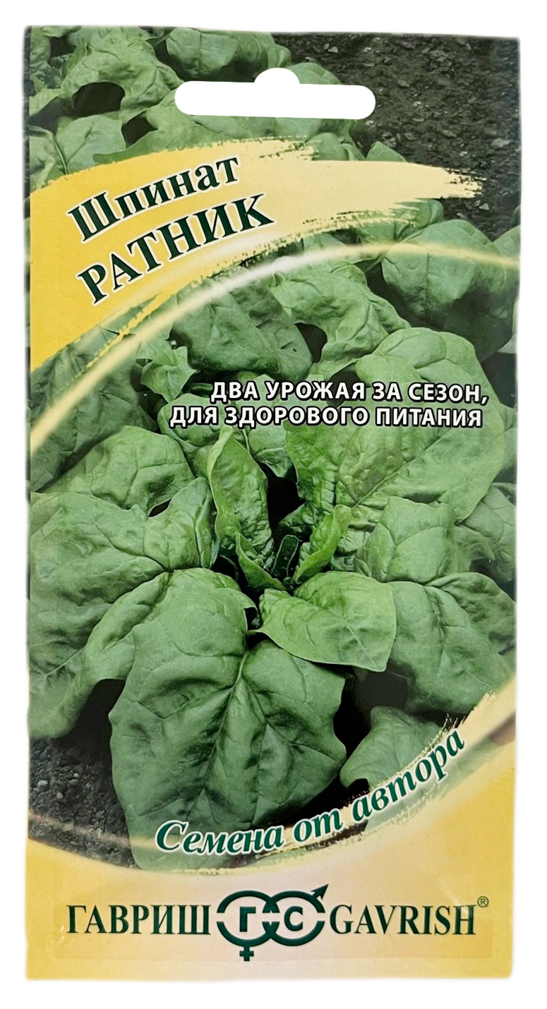 Шпинат РАТНИК ГАВРИШШпинат рекомендован диетологами, как важный компонент питания для сохранения здоровья и увеличения продолжительности жизни. Высокое содержание витамина А, С, белка, железа в легкодоступной для организма человека форме и других витаминов и микроэлементов в листьях, помогает при анемии, гипертонии и диабете. Гарниры и салаты из шпината нормализуют пищеварение и благотворно влияют на зрение. Сорт среднеспелый (от всходов до уборки 46 дней). Розетка полуприподнятая (что исключает сильное загрязнение зелени во время дождей) с 9-10 листьями. Диаметр розетки 29-33 см, масса 50 г. Лист зеленый, треугольной формы с ровным краем, слегка морщинистый, длинной 17 см, шириной 8 см. Выращивают посевом семян в открытый грунт весной (в конце апреля-мае) и поздним летом (в августе).