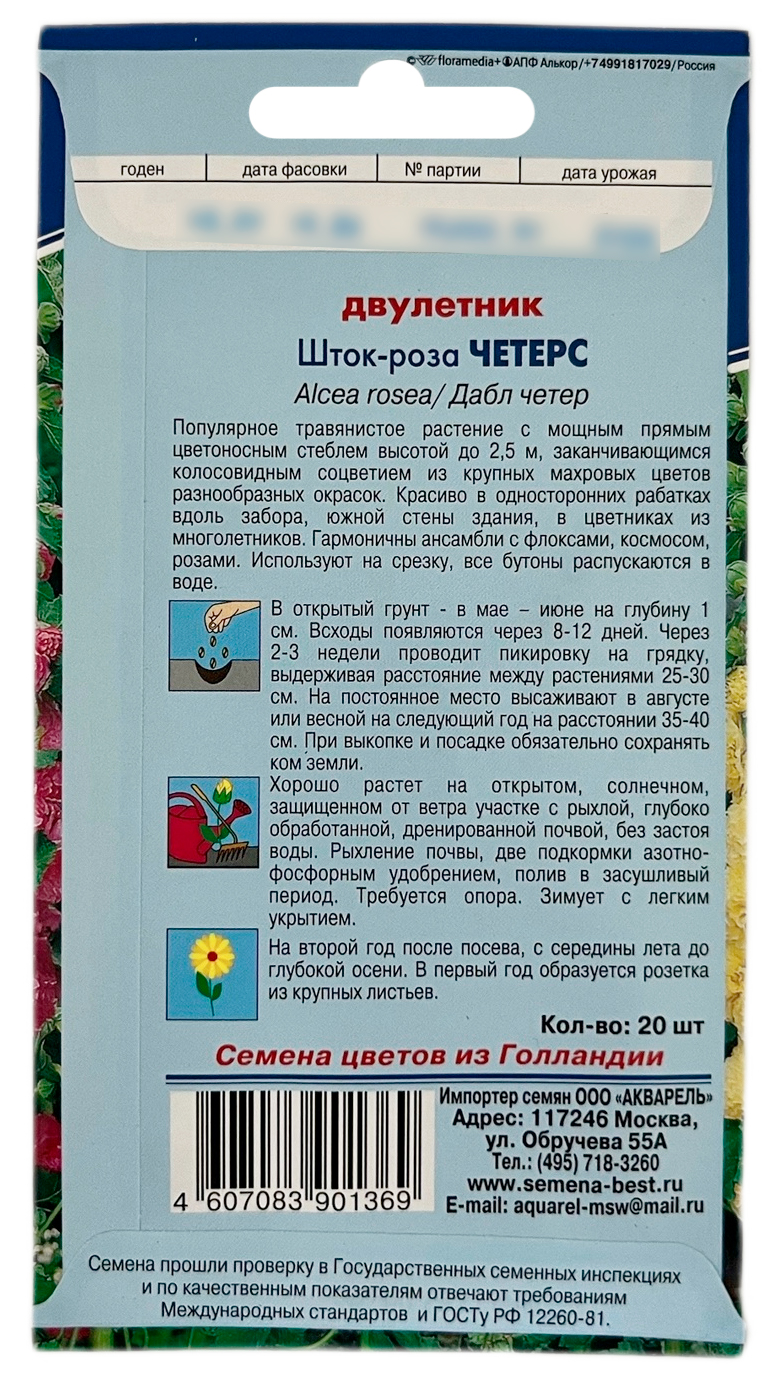 Шток роза ЧЕТЕРС АКВАРЕЛЬМноголетник, выращивается как двулетник, высотой до 2-х м. Соцветия гигантские вытянутые кисти с махровыми цветками. Цветет обильно и продолжительно. Используют для декорирования стен, оград, для срезки.