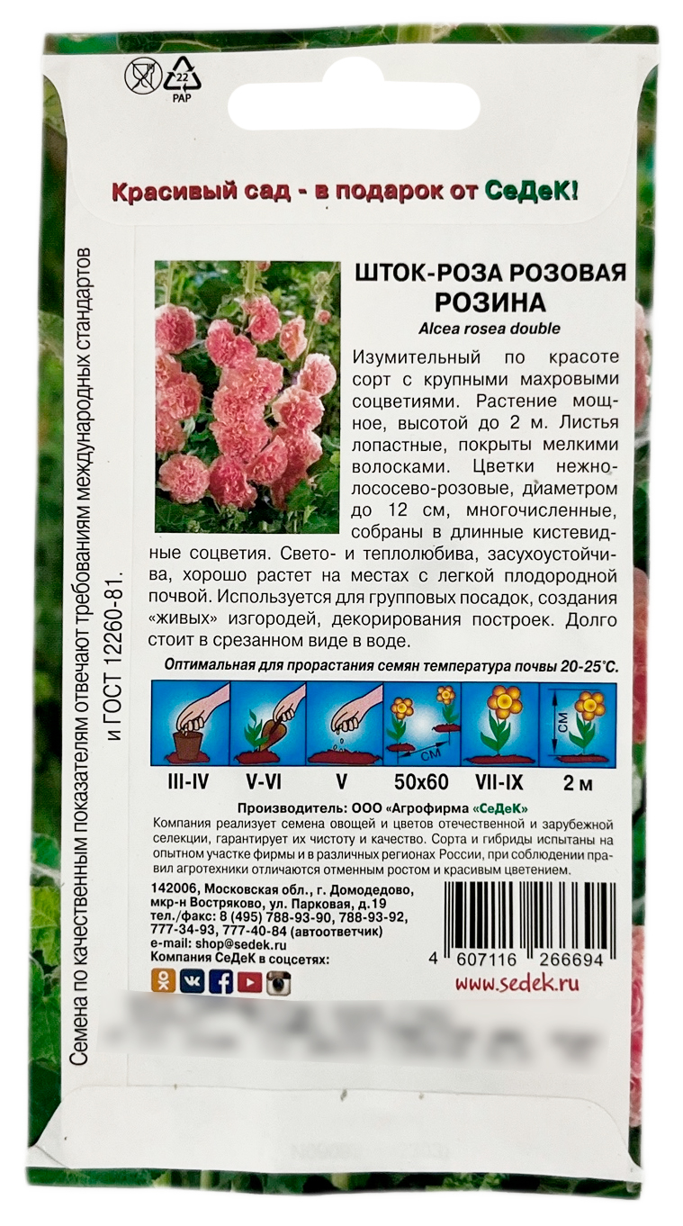 Шток-роза РОЗОВАЯ РОЗИНА СеДеКИзысканно красивый сорт с пышными соцветиями. Идеален в качестве акцентного растения и создания декоративной ширмы. Растение мощное, высокое, с лопастными листьями и длинными султанами соцветий. Цветки крупные, махровые, нежной лососево-розовой окраски. Свето- и теплолюбивое, засухоустойчивое, хорошо растет на местах с легкой плодородной почвой. Прекрасно подходит для групповых посадок, создания «живых» изгородей, декорирования построек. Долго стоит в срезанном виде.