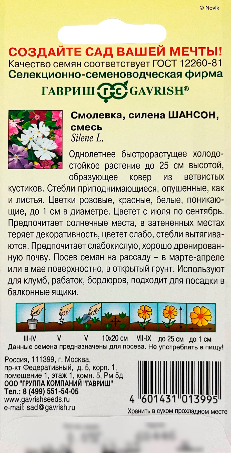 Смолевка силена Шансон смесь ГАВРИШОднолетнее быстрорастущее холодостойкое растение до 25 см высотой, образующее ковер из ветвистых кустиков. Стебли приподнимающиеся, опушеные, как и листья. Цветки розовые, красные, белые, поникающие, до 1 см в диаметре. Цветет с июля по сентябрь. Предпочитает солнечные места, в затененных местах теряет декоративность, цветет слабо, стебли вытягиваются. Требует слабокислую, хорошо дренированную почву. Посев семян в марте-апреле на рассаду или в мае в открытый грунт. Используют для клумб, рабаток, бордюров, подходит для посадки в балконные ящики.