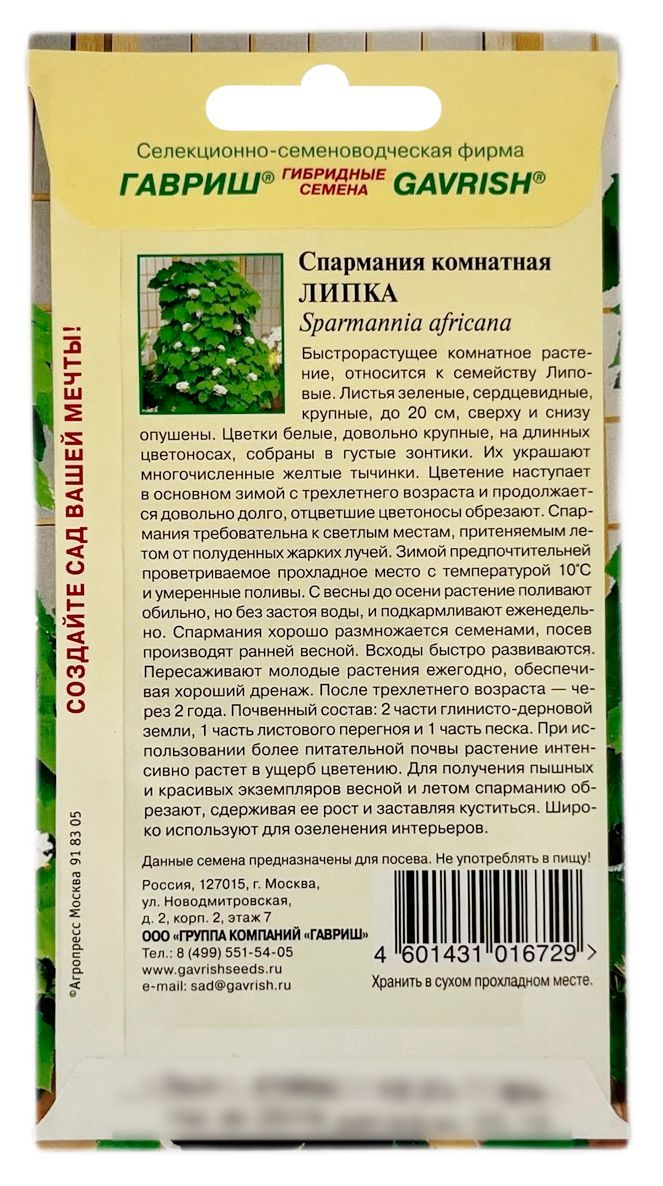Спармания комнатная ЛИПКА ГАВРИШБыстрорастущее комнатное растение, относится к семейству Липовые. Листья зеленые, сердцевидные, крупные, до 20 см, сверху и снизу опушены. Цветки белые, довольно крупные, на длинных цветоносах, собраны в густые зонтики. Их украшают красные пыльники многочисленных желтых тычинок. Цветение наступает в основном зимой с трехлетнего возраста и продолжается довольно долго, отцветшие цветоносы обрезают. Спармания требовательна к светлым местам, притеняемым летом от полуденных жарких лучей. Зимой предпочтительней проветриваемое, прохладное место с температурой 10 °C и умеренные поливы.