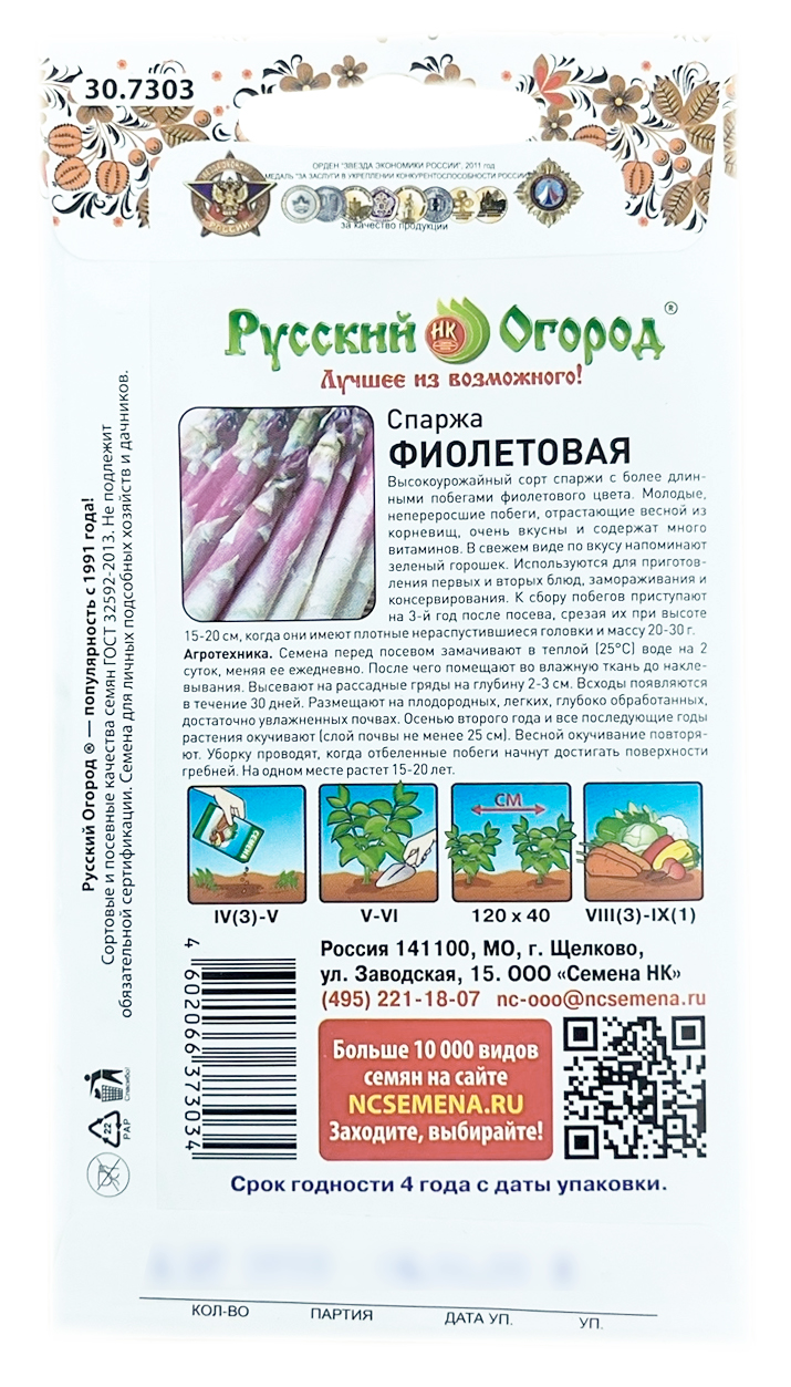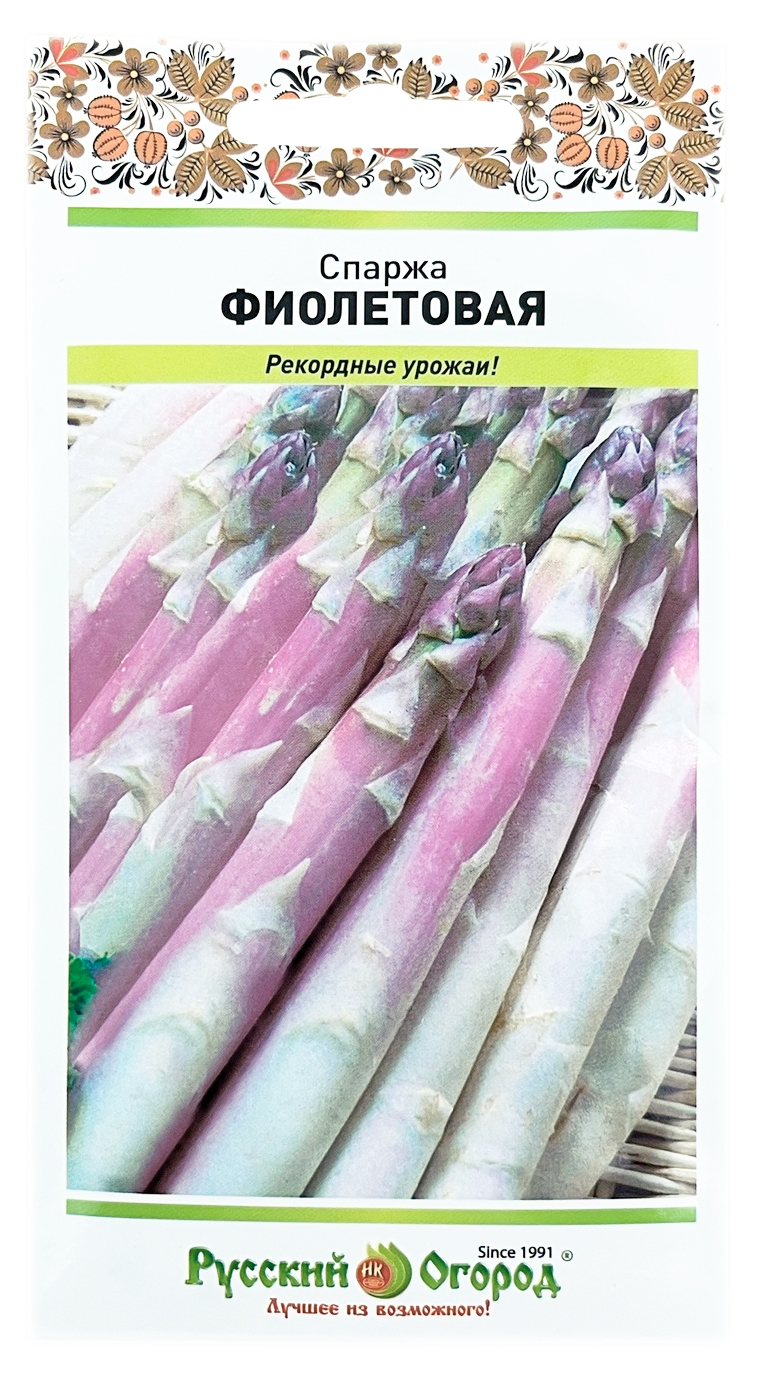 Спаржа ФИОЛЕТОВАЯ Русский огородЭтот высокоурожайный сорт спаржи, имеет наиболее длинные и толстые побеги фиолетового цвета. Осенью второго года и все последующие годы растения окучивают (слой почвы над почками не менее 25 см). Весной окучивание повторяют. Уборку проводят, когда отбеленные побеги начнут достигать поверхности гребней. Молодые непереросшие побеги, отрастающие весной из корневищ, очень вкусны и содержат много витаминов. В свежем виде по вкусу напоминают зеленый горошек. Используются для приготовления первых и вторых блюд, замораживания и консервирования. К сбору побегов приступают на 3 год после посева, срезая их при высоте 15 – 20 см, когда они имеют плотные нераспустившиеся головки и массу 20 – 30 г.