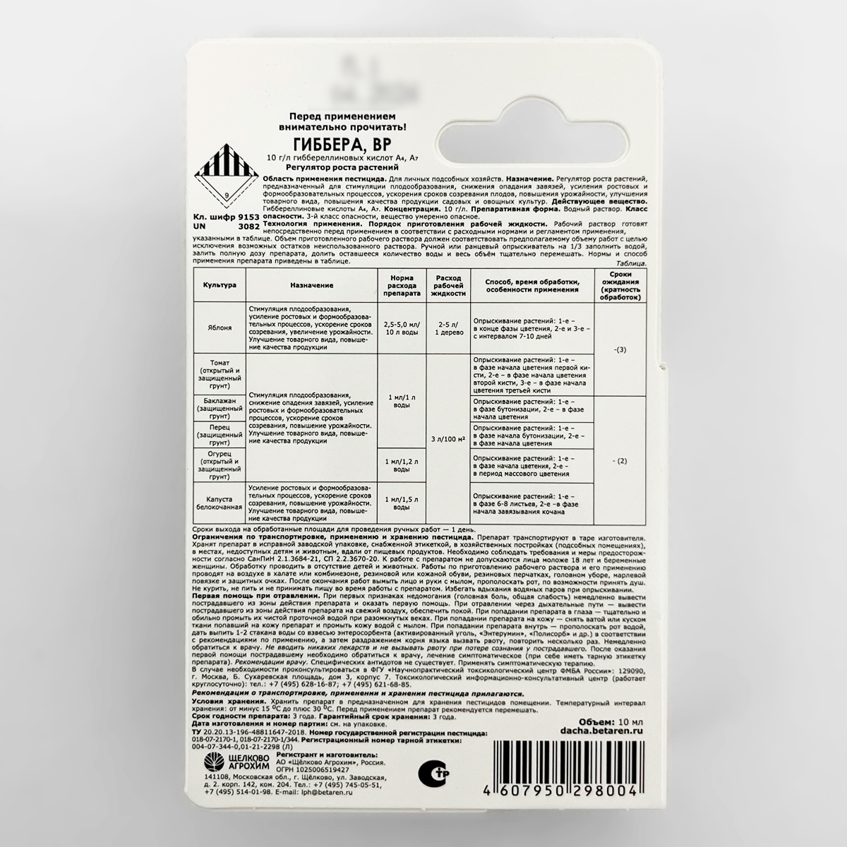 ГИББЕРА, ВР 10млРегулятор роста гормонального типа для стимулирования плодообразования, ускорения роста и созревания плодов яблони в системах интенсивного садоводства, а также овощных культур.