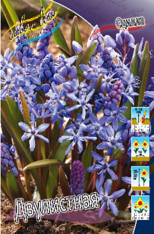 Сцилла Двулистная это луковичное растение, многолетник, относится к семейству лилейных, иное название этого растения - пролеска, дикий гиацинт. Цветки звездчатые, на единственном цветоносе, от 3 до 10 цветков собранных в рыхлые кисти. Листья прикорневые, ярко-зеленые, ланцетовидные или линейные. Высота растения 25-30 см. Окрас ярко-голубой, часто называют синий подснежник. Цветение в апреле - начале мая. Глубина посадки 5 см, расстояние между луковицами 5 см. Место посадки полутень или открытые солнечные места. К почвам нетребовательна, но любит плодородную, влажную почву. Морозостойка. Размножают вегетативно (детками) и очень активно семенами, часто самосевом. Сфера использования - рабатки, клумбы и альпийские горки.Характеристики
