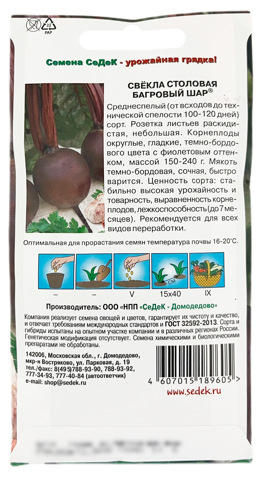 Свекла столовая Багровый Шар СеДеКСреднеспелый (от всходов до технической спелости 100-120 дней) сорт. Розетка листьев раскидистая, небольшая. Корнеплоды округлые, гладкие, темно-бордового цвета с фиолетовым оттенком, массой 150-240 г. Мякоть темно-бордовая, сочная, быстро варится. Ценность сорта: стабильно высокая урожайность и товарность, выравненность корнеплодов, лежкоспособность (до 7 месяцев). Рекомендуется для всех видов переработки.