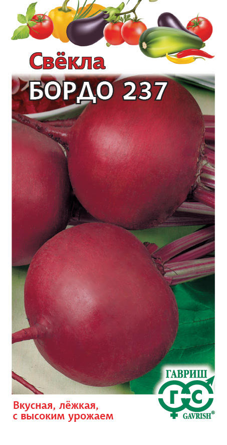 Свекла Бордо 237 3,0 г серия ТрадицияСреднеранний (62-116 дней от всходов до технической спелости) сорт. Посев в грунт конец апреля – начало мая. Схема посадки 30х6 см на глубину 2,0-2,5 см. Розетка листьев полустоячая, средней величины. Корнеплод округлый, с небольшой головкой, поверхность со слабой шероховатостью, массой 230-500 г. Мякоть интенсивно-темно-красная. Корнеплод погружен в почву наполовину. Вкусовые качества хорошие. Сорт относительно устойчив к болезням корнеплодов. Характеризуется хорошей лежкостью при зимнем хранении, сравнительной жаростойкостью. Рекомендован для использования в кулинарии и для переработки. Урожайность 3,5-8,0 кг/м2.