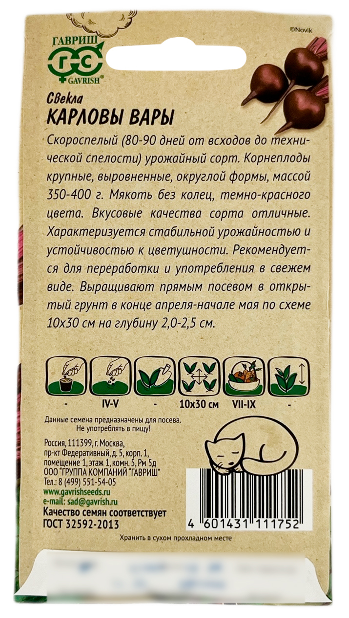 Свекла Карловы Вары ГАВРИШСкороспелый (80-90 дней от всходов до технической спелости) урожайный сорт. Корнеплоды крупные, выравненные округлой формы массой 350—400г. Мякоть без колец, темно-красного цвета. Вкусовые качества сорта отличные. Характеризуется стабильной урожайностью и устойчивостью к цветушности. Рекомендуется для переработки и употребления в свежем виде. Выращивают прямым посевом в открытый грунт в конце апреля -начале мая по схеме 10х30 см на глубину 2,0-2,5 см.