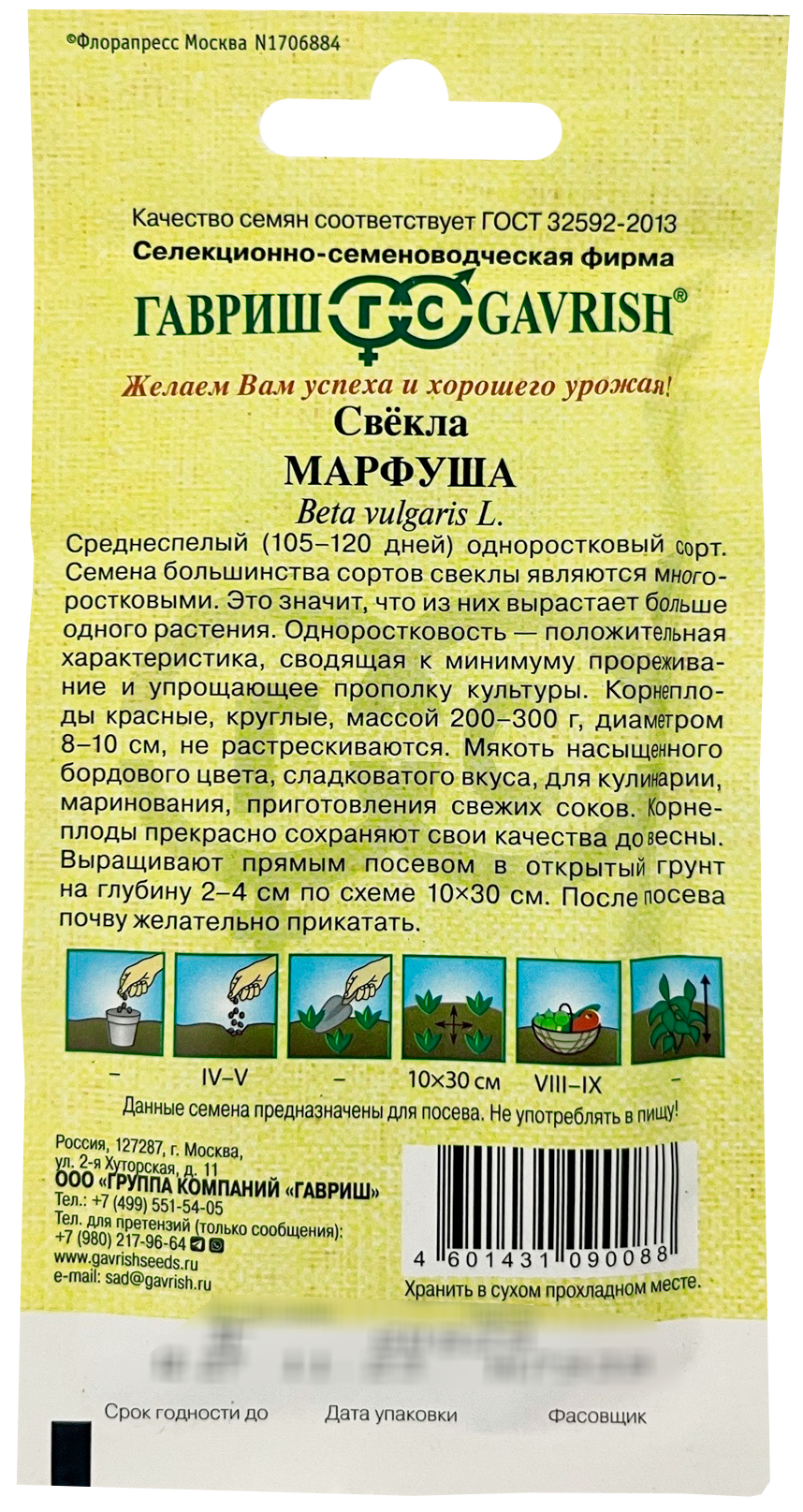 Свекла МарфушаСреднеспелый (105-120 дней) одноростковый сорт. Семена большинства сортов свеклы являются многоростковыми. Это значит, что из них вырастает больше одного растения. Одноростковость — положительная характеристика, сводящая к минимуму прореживание и упрощающее прополку культуры. Корнеплоды красные, круглые, массой 200-300 г, диаметром 8-10 см, не растрескиваются. Мякоть насыщенного бордового цвета, сладковатого вкуса, для кулинарии, маринования, приготовления свежих соков. Корнеплоды прекрасно сохраняют свои качества до весны. Выращивают прямым посевом в открытый грунт на глубину 2-4 см по схеме 10х30 см. После посева почву желательно прикатать.