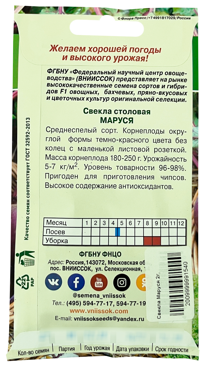 Свекла столовая Маруся ВНИИССОКСреднеспелый сорт. Корнеплоды округлой формы темно-красного цвета без колец с маленькой листовой розеткой. Обладает отличными вкусовыми качествами и высоким содержанием антиоксидантов. Масса корнеплода 180-250 г. Урожайность5-7 кг/м2. Уровень товарности 96-98%. Пригоден для приготовления чипсов.