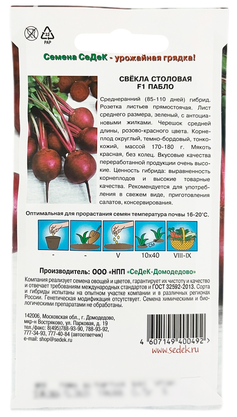 Свёкла столовая F1 ПАБЛО СеДеКСреднеранний (85-110 дней) гибрид. Розетка листьев прямостоячая. Лист среднего размера, зеленый, с антоциановыми жилками. Черешок средней длины, розово-красного цвета. Корнеплод округлый, темно-бордовый, тонкокожий, массой 170-180 г. Мякоть красная, без колец. Вкусовые качества переработанной продукции очень высокие. Ценность гибрида: выравненность корнеплодов и высокие товарные качества. Рекомендуется для употребления в свежем виде, приготовления салатов, консервирования.