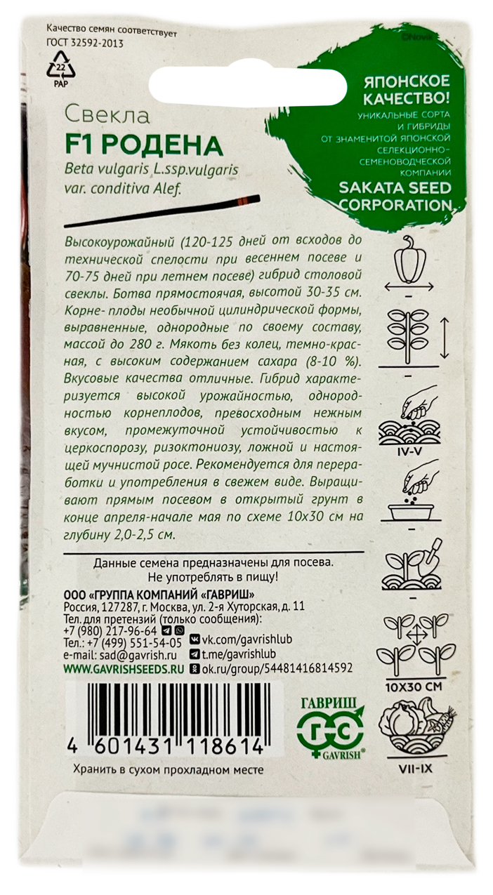 Свекла F1 РОДЕНА ГАВРИШВысокоурожайный (120-125 дней при весеннем посеве и 70-75 при летнем посеве от всходов до технической спелости) гибрид столовой свеклы. Ботва прямостоячая, высотой 30-35 см. Корнеплоды необычной цилиндрической формы, выравненные, однородные по своему составу, массой до 280 г. Мякоть без колец, темно-красная с высоким содержанием сахара 8-10 %. Вкусовые качества отличные. Гибрид характеризуется высокой урожайностью однородностью корнеплодов, превосходным нежным вкусом, Промежуточной устойчивостью к церкоспорозу, ризоктониозу, ложной мучнистой и настоящей мучнистой росам. Рекомендуется для переработки и употребления в свежем виде. Выращивают прямым посевом в открытый грунт в конце апреля -начале мая по схеме 10х30 см на глубину 2,0-2,5 см.