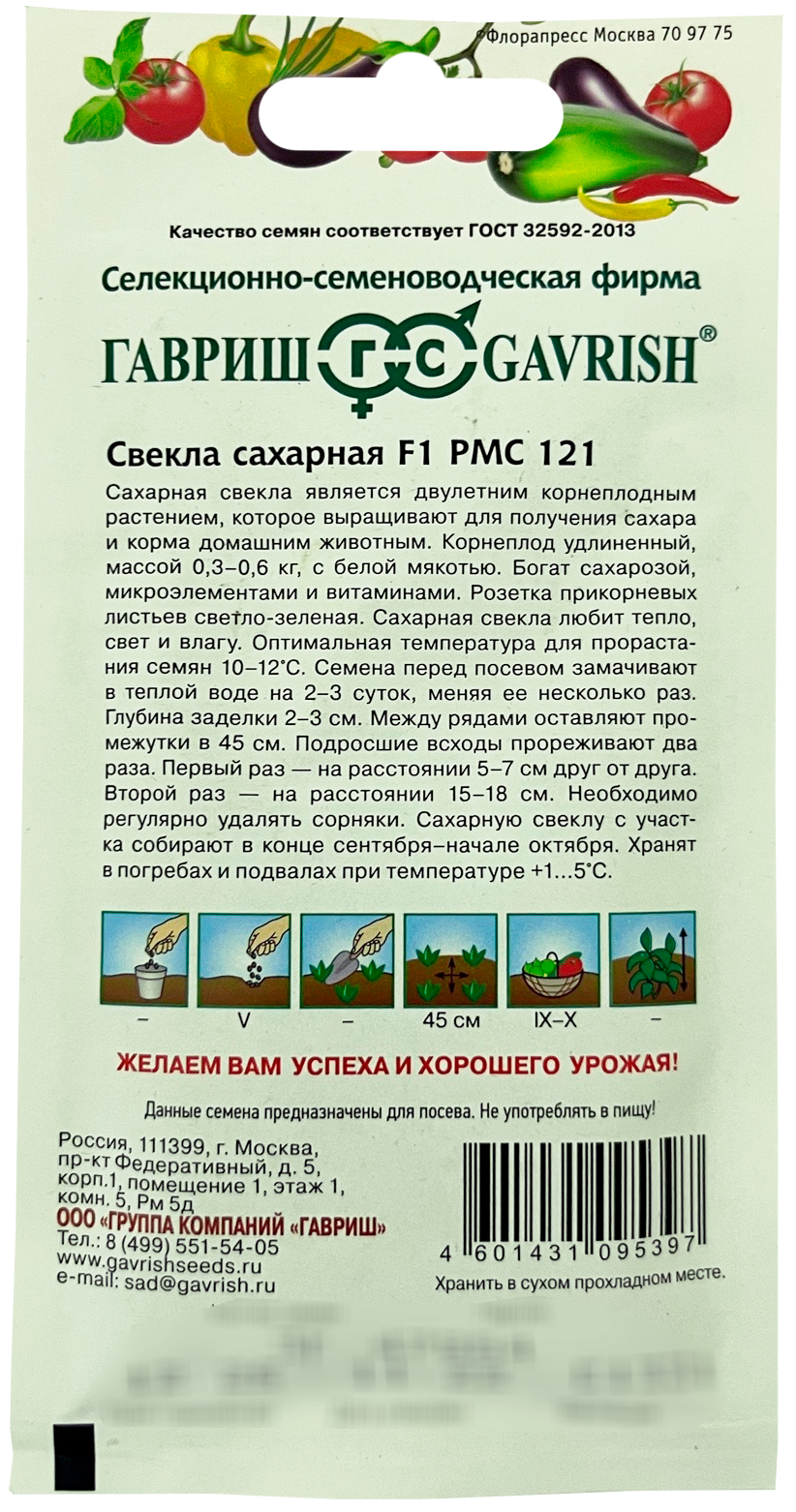 Свекла Сахарная F1 РМС 121 ГАВРИШСахарная свекла богата сахарозой, микроэлементами и витаминами. Корнеплод удлиненный, массой 0,3–0,6 кг, с белой мякотью. Розетка листьев светло-зеленая. Корнеплод используют в кулинарии (цукаты), в качестве корма для животных. Сахарная свекла любит тепло, свет и влагу. Оптимальная температура для прорастания семян 10–12ºС. Семена перед посевом замачивают в теплой воде на 2–3 суток, меняя ее несколько раз. Глубина заделки 2–3 см. Урожай собирают в конце сентября–начале октября. Сахарную свеклу хранят в погребах при температуре +1…+5°С.