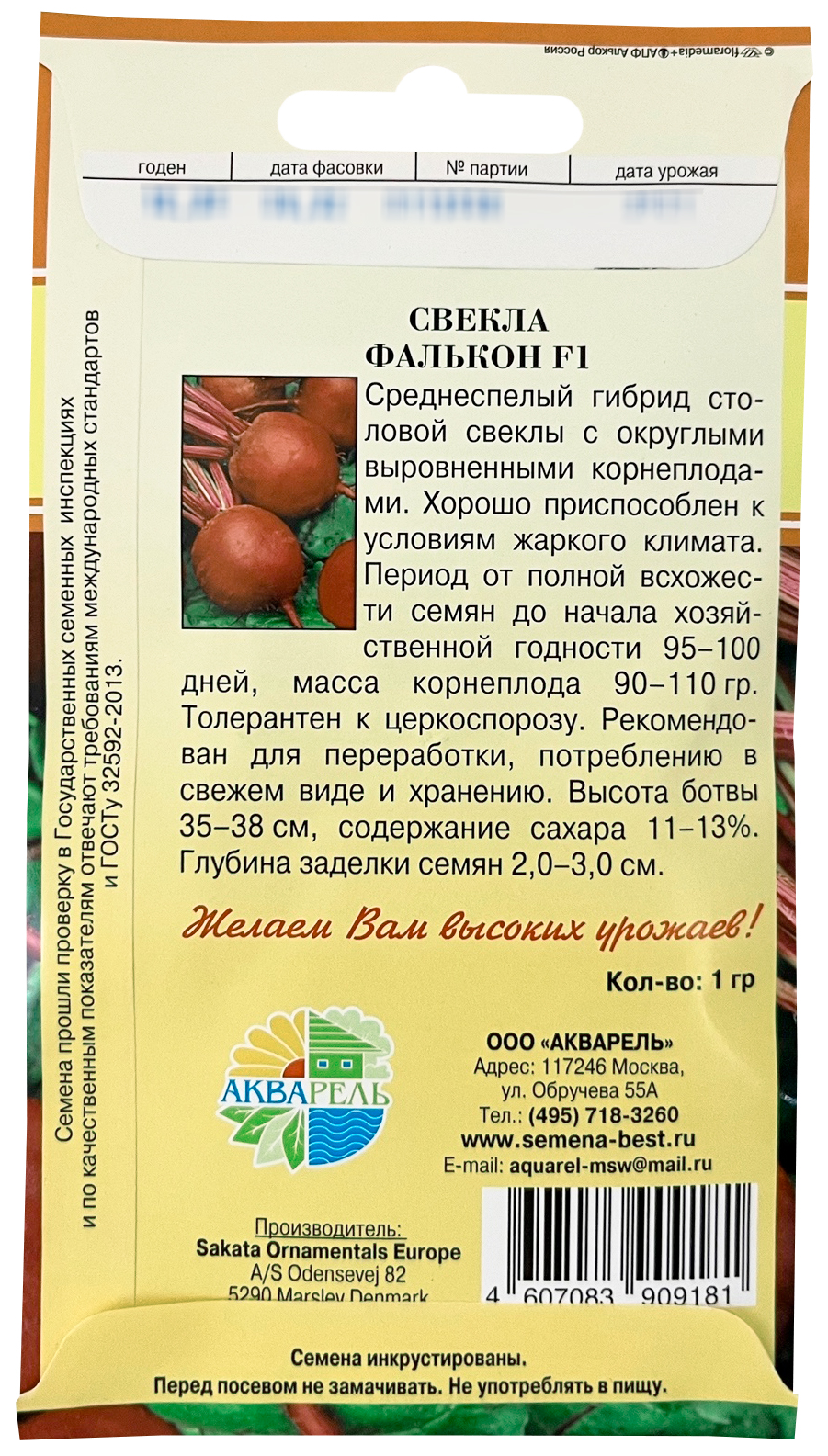 Свекла столовая Фалькон F1 АКВАРЕЛЬСреднеспелый гибрид столовой свеклы c округлыми выровненными корнеплодами. Хорошо приспособлен к условиям жаркого климата. Период от полной всхожести семян до начала хозяйственной годности 95-100 дней, масса корнеплода 90-110гр. Толерантен к церкоспорозу. Рекомендован для переработки, потреблению в свежем виде и хранению. Высота ботвы 35-38см, содержание сахара 11-13%. Глубина заделки семян 2,0-3,0 см.