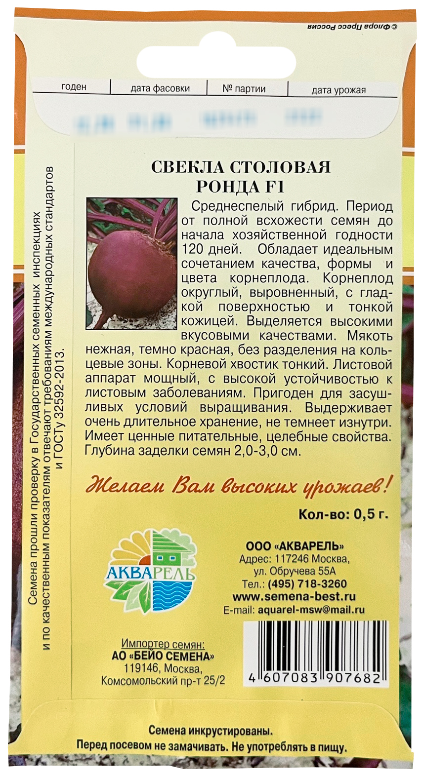 Свекла столовая Ронда F1 АКВАРЕЛЬСреднеспелый гибрид. Период от полной всхожести семян до начала хозяйственной годности 120 дней. Обладает идеальным сочетанием качества, формы корнеплода и цвета. Корнеплод округлый, выровненный, с глад-кой поверхностью и тонкой кожицей. Выделяется высокими вкусовыми качествами. Мякоть нежная, темно красная, без разделения на кольцевые зоны. Корневой хвостик тонкий. Листовой аппарат мощный, с высокой устойчивостью к листовым заболеваниям. Пригоден для засушливых условий выращивания. Выдерживает очень длительное хранение, не темнеет изнутри. Имеет ценные питательные, целебные свойства. Глубина заделки семян 2,0-3,0 см.