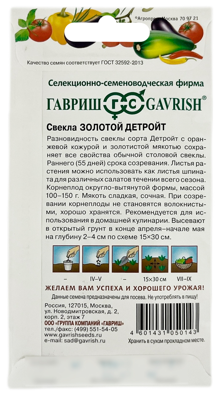 Свекла Золотой детройт ГАВРИШРазновидность свеклы сорта Детройт с оранжевой кожурой и золотистой мякотью сохраняет все свойства обычной столовой свеклы. Раннего (55 дней) срока созревания. Листья растения можно использовать как листья шпината для различных салатов течении всего сезона. Корнеплод округло-вытянутой формы, массой 100-150 г. Мякоть сладкая, сочная. При созревании корнеплоды не становятся волокнистыми, хорошо хранятся. Рекомендуется для использования в домашней кулинарии. Высевают в открытый грунт в конце апреля-начале мая на глубину 2-4 см по схеме 15х30 см.