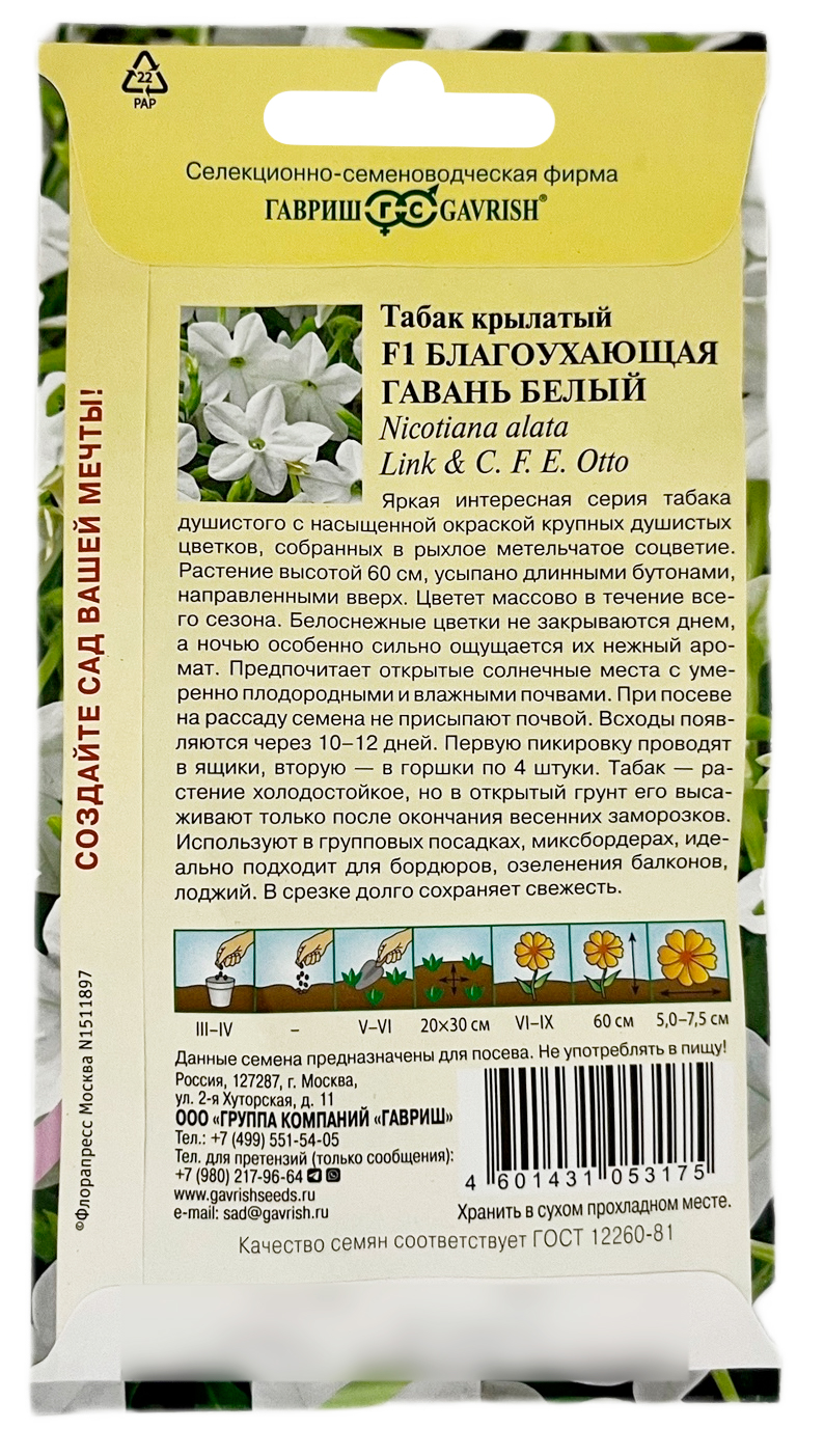 Табак крылатый F1 БЛАГОУХАЮЩАЯ ГАВАНЬ БЕЛЫЙ ГАВРИШЯркая интересная серия табака душистого с насыщенной окраской крупных душистых цветков, собранных в рыхлое метельчатое соцветие. Растение высотой 60 см, усыпано длинными бутонами, направленных вверх. Цветет массово в течение всего сезона. Белоснежные цветки не закрываются днем, а ночью особенно сильно ощущается их нежных аромат. Предпочитает открытые солнечные места с умеренно плодородными и влажными почвами. При посеве на рассаду семена не присыпают почвой. Всходы появляются через 10-12 дней. Первую пикировку проводят в ящики, вторую — в горшки по 4 штуки. Табак — растение холодостойкое, но в открытый грунт его высаживают только после окончания весенних заморозков. Используют в групповых посадках, миксбордерах, идеально подходит для бордюров, озеленения балконов, лоджий. В срезке долго сохраняет свежесть.