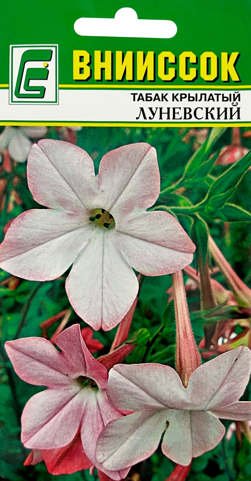 Табак Луневский крылатый ВНИИССОКМноголетнее растение, выращиваемое как однолетник. Высота растений 70-90 см. Цветки бледно-розовые, с темно-розовой трубкой, до 5 см в диаметре, собраны в крупные гроздевидные соцветия. Цветение с июля по сентябрь. Рекомендуется для клумб, групп и в качестве солитёрных растений. Посев на рассаду во второй половине марта, высадка в грунт во второй половине мая. Схема высадки 30х40 см.