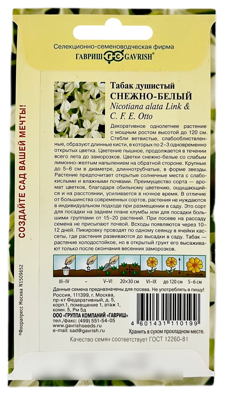 Табак Снежно-белый, душистый ГАВРИШДекоративное однолетнее растение с мощным ростом высотой до 120 см. Стебли ветвистые, слабооблиствленные, образуют длинные кисти, в которых по 2-3 одновременно открытых цветка. Цветение пышное, продолжается в течении всего лета до заморозков. Цветки снежно-белые со слабым лимонно-желтым напылением на обратной стороне, крупные до 5-6 см в диаметре, длиннотрубчатые, в форме звезды. Растение предпочитает открытые солнечные места с слабокислыми и влажными почвами. Преимущество сорта — аромат цветков, благодаря обильному цветению, ощущающийся и на расстоянии, усиливается в ночное время. В отличие от большинства современных сортов, растения не нуждаются в индивидуальном подходе при размещении в саду. Это сорт для посадки на заднем плане клумбы или для посадки большими группами от 15-20 растений. При посеве на рассаду семена не присыпают почвой. Всходы появляются через 10-12 дней. Пикировку проводят по одному сеянцу в ячейки кассеты, где растения развиваются до высадки в саду Табак — растение холодостойкое, но в открытый грунт его высаживают только после окончания весенних заморозков.
