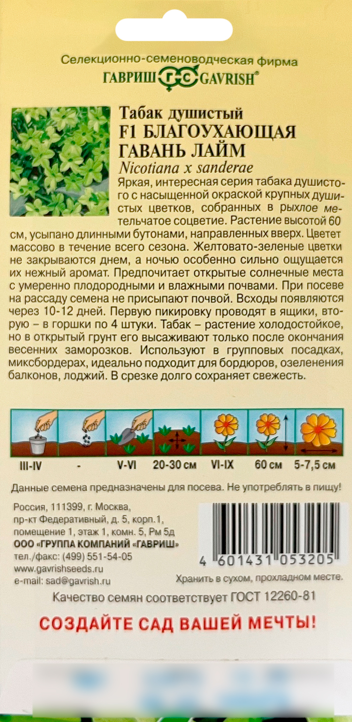 Табак душистый Благоухающая гавань лайм F1 ГАВРИШЯркая интересная серия табака душистого с насыщенной окраской крупных душистых цветков, собранных в рыхлое метельчатое соцветие. Растение высотой 60 см, усыпано длинными бутонами, направленных вверх. Цветет массово в течение всего сезона. Желтовато-зеленые цветки не закрываются днем, а ночью особенно сильно ощущается их нежных аромат. Предпочитает открытые солнечные места с умеренно плодородными и влажными почвами. При посеве на рассаду семена не присыпают почвой. Всходы появляются через 10-12 дней. Первую пикировку проводят в ящики, вторую — в горшки по 4 штуки. Табак — растение холодостойкое, но в открытый грунт его высаживают только после окончания весенних заморозков. Используют в групповых посадках, миксбордерах, идеально подходит для бордюров, озеленения балконов, лоджий. В срезке долго сохраняет свежесть.