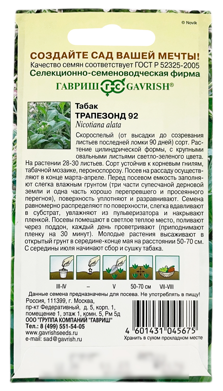 Табак ТРАПЕЗОНД 92 ГАВРИШНизкое содержание никотина! Скороспелый (от высадки до созревания листьев последней ломки 90 дней) сорт с низким содержанием никотина (около 1%) и высокими курительными свойствами (по показателям крепость, аромат, вкус и сладость — 38,3 балла). Растение цилиндрической формы, с крупными овальными листьями светло-зеленого цвета. На растении 28-30 листьев. Сорт устойчив к корневым гнилям, табачной мозаике, пероноспорозу. Выход сырья первого товарного сорта 85-90%.