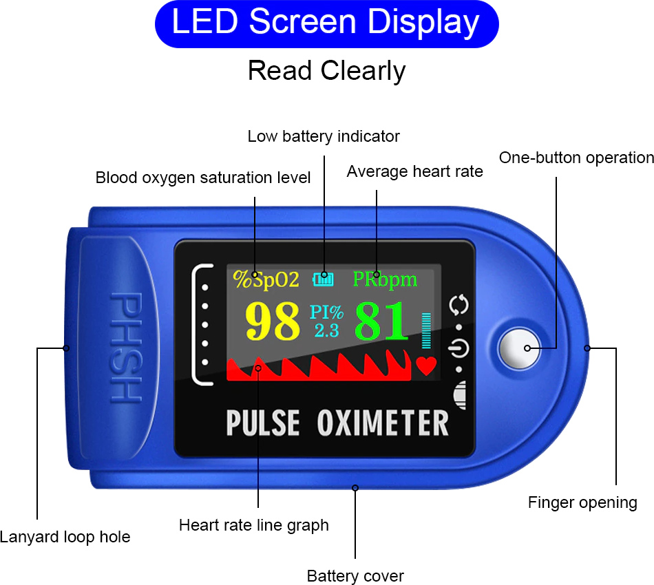 Oled-дисплей - низкое энергопотребление, oled-дисплей, 2 направления можно регулировать для удобного чтения. Даже пожилым людям, также можно точно и легко читать значения оксиметров. Удобный и компактный, с ремешком, портативный для дома или путешествий.