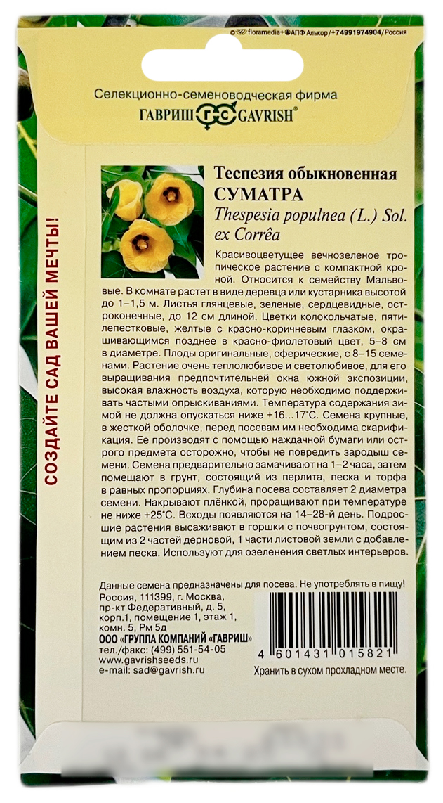 Теспезия обыкновенная СУМАТРА ГАВРИШКрасивоцветущее вечнозеленое тропическое растение с компактной кроной. Относится к семейству Мальвовые. В комнате растет в виде деревца или кустарника высотой до 1-1,5 м. Листья глянцевые, зеленые, сердцевидные, остроконечные, до 12 см длиной. Цветки колокольчатые, пятилепестковые, желтые с красно-коричневым глазком, окрашивающимся позднее в красно-фиолетовый цвет, 5-8 см в диаметре. Плоды оригинальные, сферические, с 8-15 семенами. Растение очень теплолюбивое и светолюбивое, для его выращивания предпочтительней окна южной экспозиции, высокая влажность воздуха, которую необходимо поддерживать частыми опрыскиваниями. Температура содержания зимой не должна опускаться ниже 16-17 °C.
