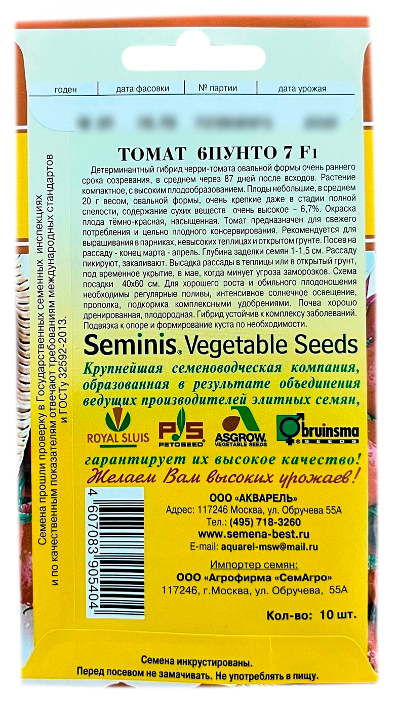 Томат 6пунто 7 F1 АКВАРЕЛЬДетерминантный гибрид черри-томата овальной формы очень раннего срока созревания, в среднем через 87 дней после всходов. Растение компактное, с высоким плодообразованием. Плоды небольшие, в среднем 20 г весом, овальной формы, очень крепкие даже в стадии полной спелости, содержание сухих веществ очень высокое - 6,7%.