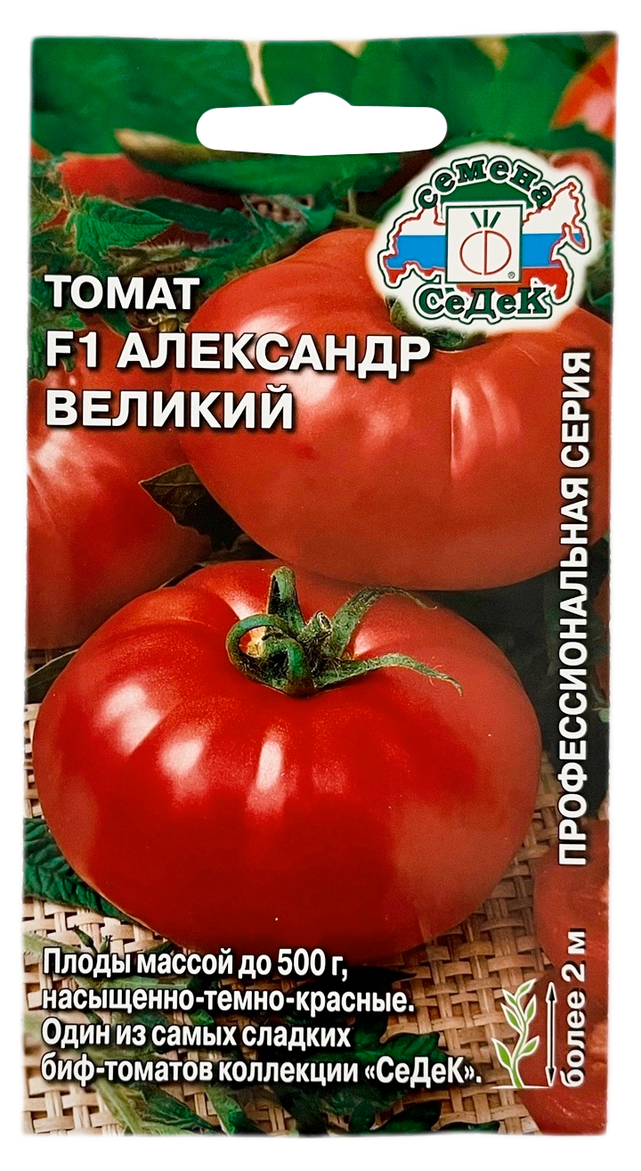 Томат АЛЕКСАНДР ВЕЛИКИЙ СеДеКСреднеспелый (110-115 дней) гибрид для защищенного грунта. Растение индетерминантное, среднерослое, высотой 1-1,2 м. В кисти формируется 4-5 плодов. Плоды плоскоокруглые, очень крупные, плотные, не зрелые – темно-зеленые, зрелые – насыщенно-темно-красные, массой 300-500 г, толстокожие. Мякоть красно-малиновая, мясистая, имеет очень сладкий вкус. Урожайность в теплицах 10-15 кг/м2. Ценность гибрида: устойчивость к вирусу табачной мозаики, вертициллезному и фузариозному увяданию, стрессоустойчивость, плоды не растрескиваются и долго сохраняют товарный вид, при хранении и транспортировке. Рекомендуется для употребления в свежем виде, приготовления салатов и соков, и других видов переработки.