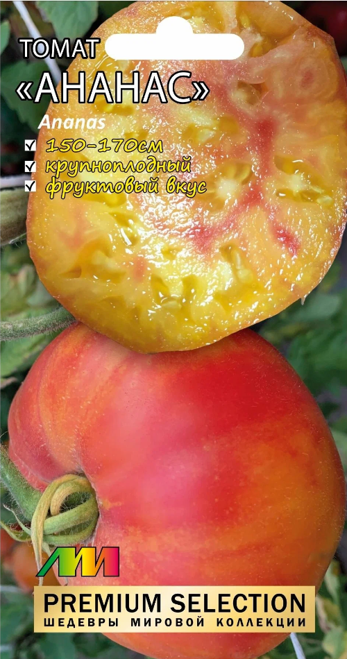 Томат Ананас - коллекционный сорт, предназначенный для выращивания в теплице. Высота растения 1,5-1,7 м.Плоды крупные, массой 350 г, желтые с розовым румянцем, мясистые, сладкие. Вкусны в свежем виде, а также из них получаются отличные соки с мякотью. Отечественные огородники ценят томаты этого сорта за высокую устойчивость к болезням и за его продолжительное плодоношение. Первые соцветия томата ананас появляются возле 8-9-го листочков. На каждой кисти вызревает порядка 5-6 крупных плодов.Свое название сорт получил благодаря внешнему виду плодов: кожура и мякоть помидоров имеют насыщенный оттенок, на овощах отмечается рельефная ребристость, а на разрезе зрелого томата можно увидеть соответствующий рисунок.Характеристики