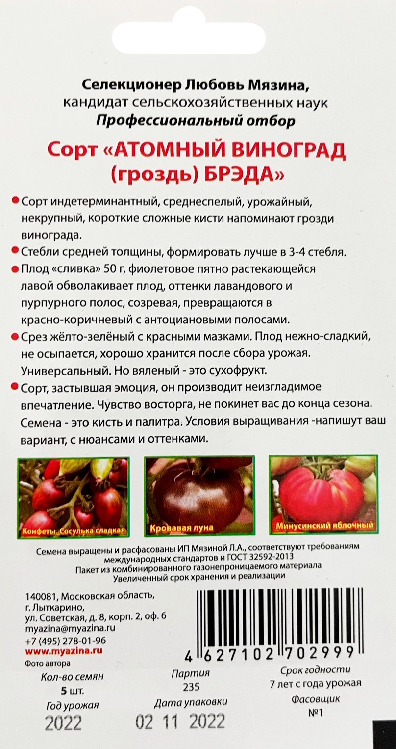 Томат "Атомный виноград гроздь БРЭДА"Сорт индетерминантный, среднеспелый, урожайный, некрупный, короткие сложные кисти напоминают грозди винограда. Стебли средней толщины, формировать лучше в 3-4 стебля. Плод "сливка" 50г, фиолетовое пятно растекающейся лавой обволакивает плод, оттенки лавандового и пурпурного полос, созревая, превращаются в красно-коричневый с антоциановыми полосами.
