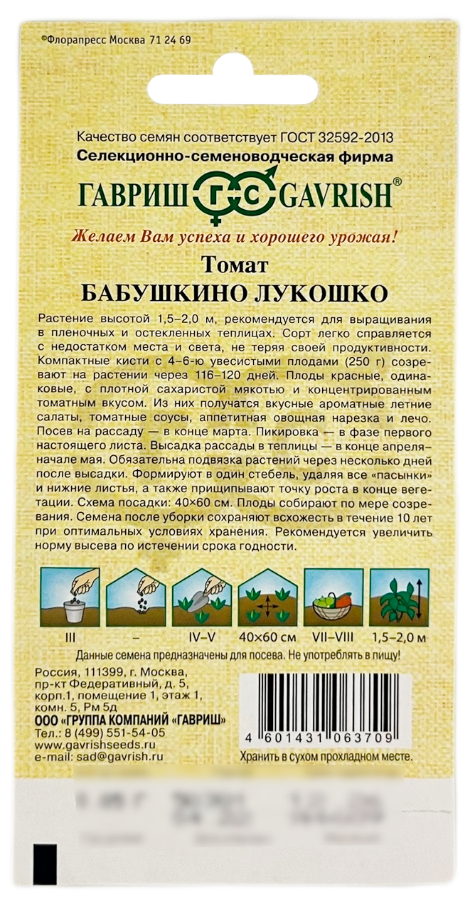 Томат БАБУШКИНО ЛУКОШКО ГАВРИШРастение среднерослое, высотой 1,5-2,0 м, рекомендуется для выращивания в пленочных и остекленных теплицах. Сорт легко справляется с недостатком места и света, не теряя своей продуктивности. Компактные кисти с 4-6-ю увесистыми плодами (250 г) созревают на растении через 116-120 дней. Плоды красные, одинаковые, с плотной сахаристой мякотью и концентрированным томатным вкусом. Из них получатся вкусные ароматные летние салаты, томатные соусы, аппетитная овощная нарезка и лечо. Посев на рассаду — в конце марта. Пикировка — в фазе первого настоящего листа. Высадка рассады в теплицы — в конце апреля-начале мая. Обязательна подвязка растений через несколько дней после высадки. Формируют в один стебель, удаляя все «пасынки» и нижние листья, а также прищипывают точку роста в конце вегетации. Схема посадки: 40х60 см. Плоды собирают по мере созревания.