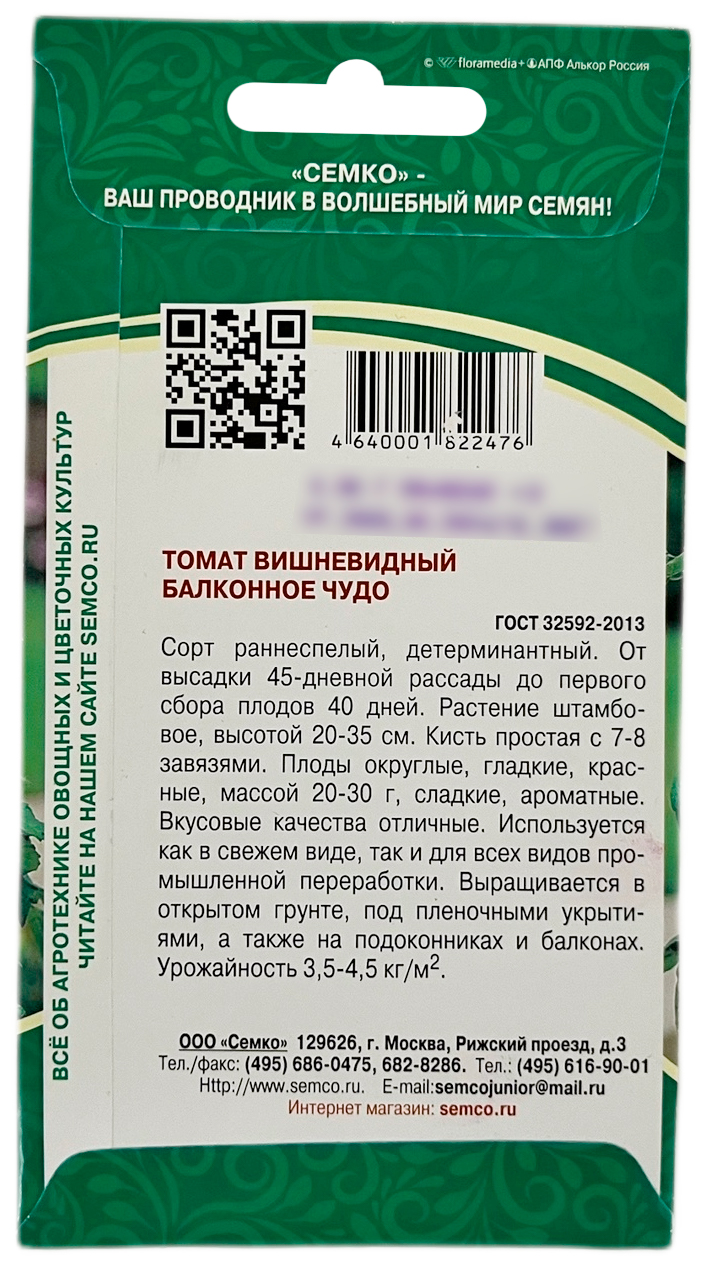 Томат балконное чудо СЕМКОРанний, детерминантный низкорослый сорт, рекомендуемый для выращивания в горшках. От высадки 45-дневной рассады до первого сбора 40 дней. Растение штамбовое, высотой 20–35 см. Кисть простая с 7–8 завязями. Помидоры округлые, гладкие, красные, мелкие, массой 20–30 г, сладкие, ароматные. Вкусовые качества отличные. Используется как в свежем виде, так и для всех видов промышленной переработки. Выращивается в открытом грунте, а также на подоконниках и балконах. Урожайность 3,5–4,5 кг/м2.