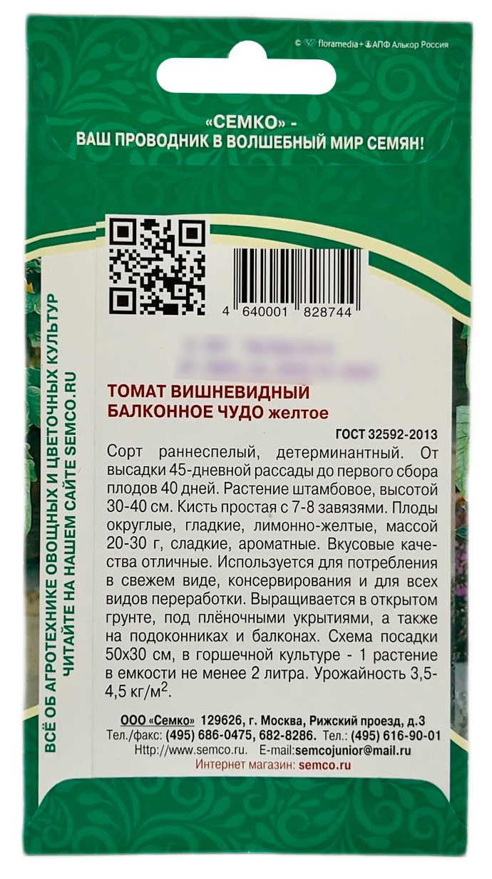 Томат балконное чудо желтое СЕМКОТомат штамбовый, детерминантный. От высадки 45-дневной рассады до первого сбора помидоров 40 дней. Растение низкорослое, высотой 30-40 см. Кисть простая с 7-8 завязями. Помидоры округлой формы, гладкие, лимонно-желтые, массой 20-30 г, сладкие, ароматные. Вкусовые качества томатов отличные. Используется для потребления в свежем виде, консервирования, и для всех видов переработки. Желтый томат Балконное Чудо выращивается в открытом грунте, под плёночными укрытиями, а также на подоконниках и балконах. Урожайность 3,5-4,5 кг/м2.