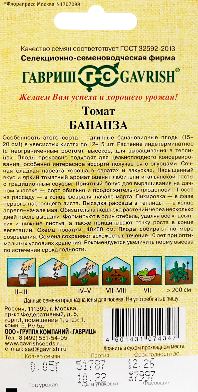 Томат БананзаОсобенность этого сорта — длинные банановидные плоды (15-20 см!) в увесистых кистях по 12-15 шт. Растение индетерминатное (с неограниченным ростом), высокое, для выращивания в теплицах. Плоды прекрасно подходят для цельноплодного консервирования, особенно интересное ассорти, получается с огурцами. Плотная сладкая нарезка хороша в салатах и закусках. Насыщенный вкус и яркий томатный аромат оценят любители итальянской пасты с традиционным соусом. Приятный бонус для выращивания на дачном участке — сорт обильно и продолжительно плодоносит. Посев на рассаду — в конце февраля – начале марта. Пикировка — в фазе первого настоящего листа. Высадка рассады в теплицы — в конце апреля — начале мая. Обязательна подвязка растений через несколько дней после высадки. Формируют в один стебель, удаляя все «пасынки» и нижние листья, а также прищипывают точку роста в конце вегетации. Схема посадки: 40х60 см. Плоды собирают по мере созревания.