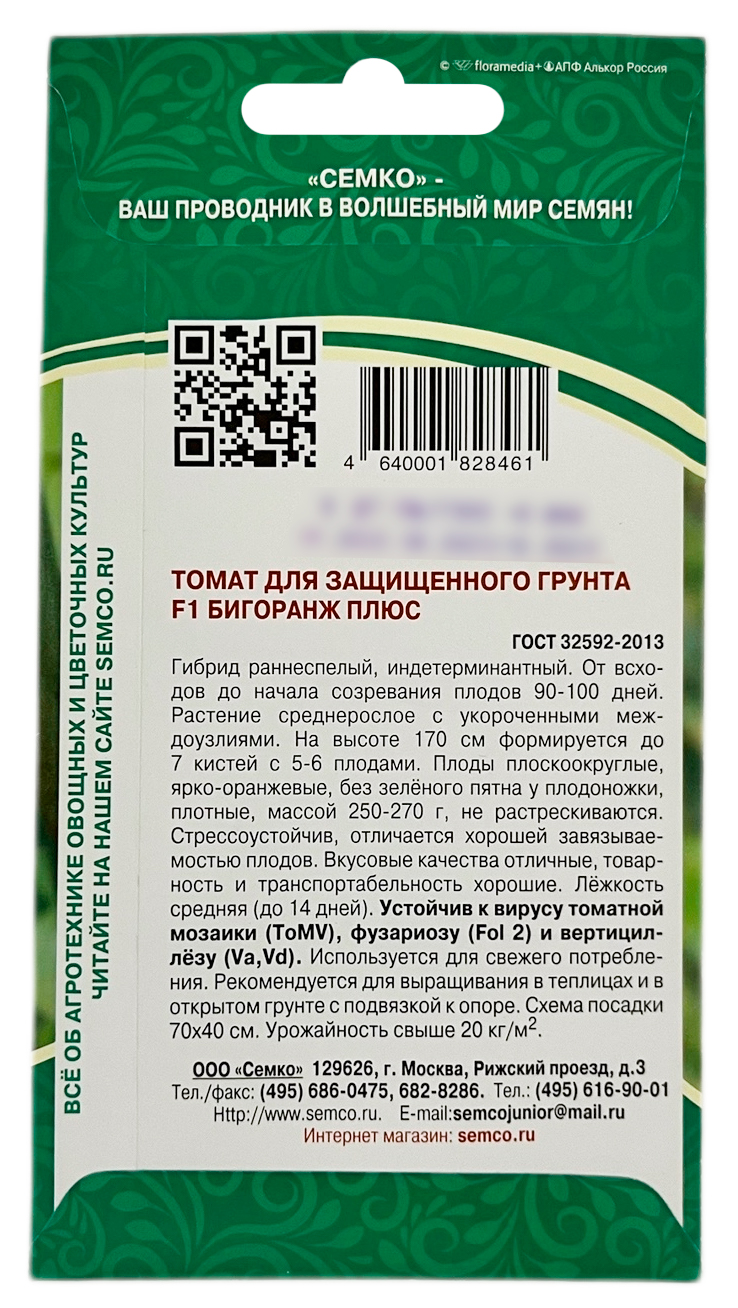 Томат БИГОРАНЖ ПЛЮС СЕМКОРанний, индетерминантный гибрид томата для защищенного грунта. От всходов до начала созревания плодов 90-100 дней. Растение среднерослое, с укороченными междоузлиями. На высоте 170 см формируется до 7 кистей с 5-6 плодами. Плоды плоскоокруглые, ярко-оранжевые, без зеленого пятна у плодоножки, плотные, массой 250-270 грамм, не растрескиваются. Гибрид стрессоустойчив, отличается хорошей завязываемостью плодов. Вкусовые качества отличные, товарность и транспортабельность хорошие. Лежкость - до 14 дней. Томат Бигоранж Плюс F1 устойчив к вирусу томатной мозаики (TMV), фузариозу (Flo 2) и вертициллезу (Va, Vd).. Используется для выращивания в теплицах и в открытом грунте с подвязкой к опоре. Схема посадки 70х40 см. Урожайность свыше 20 кг/м2.