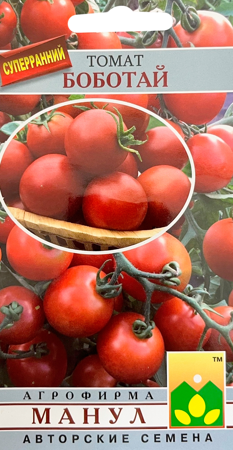 Томат БоботайТомат Боботай – ультраскороспелый сорт, созревает на 72-75 день от всходов. Растения низкорослые, супердетерминантного типа, высотой 35-40 см. Идеально подходит для открытого грунта, временных укрытий, балконов, лоджий, для горшечной культуры. Растение среднеоблиственное. Лист горизонтально пониклый, средний, слабо гофрированный, обыкновенного типа, зелёного цвета. Соцветие простое, компактное, с 6-8 плодами. Соцветия располагаются через 1-2 листа или непосредственно друг за другом. После образования 3-х соцветий рост основного побега самоограничивается, и далее рост продолжает пасынок. Плоды округлой формы, гладкие, массой 35-40 г, с 2-3 семенными камерами, при созревании – красные, иногда красно-оранжевые. Вкусовые качества плодов хорошие; используются в свежем виде и для переработки.
